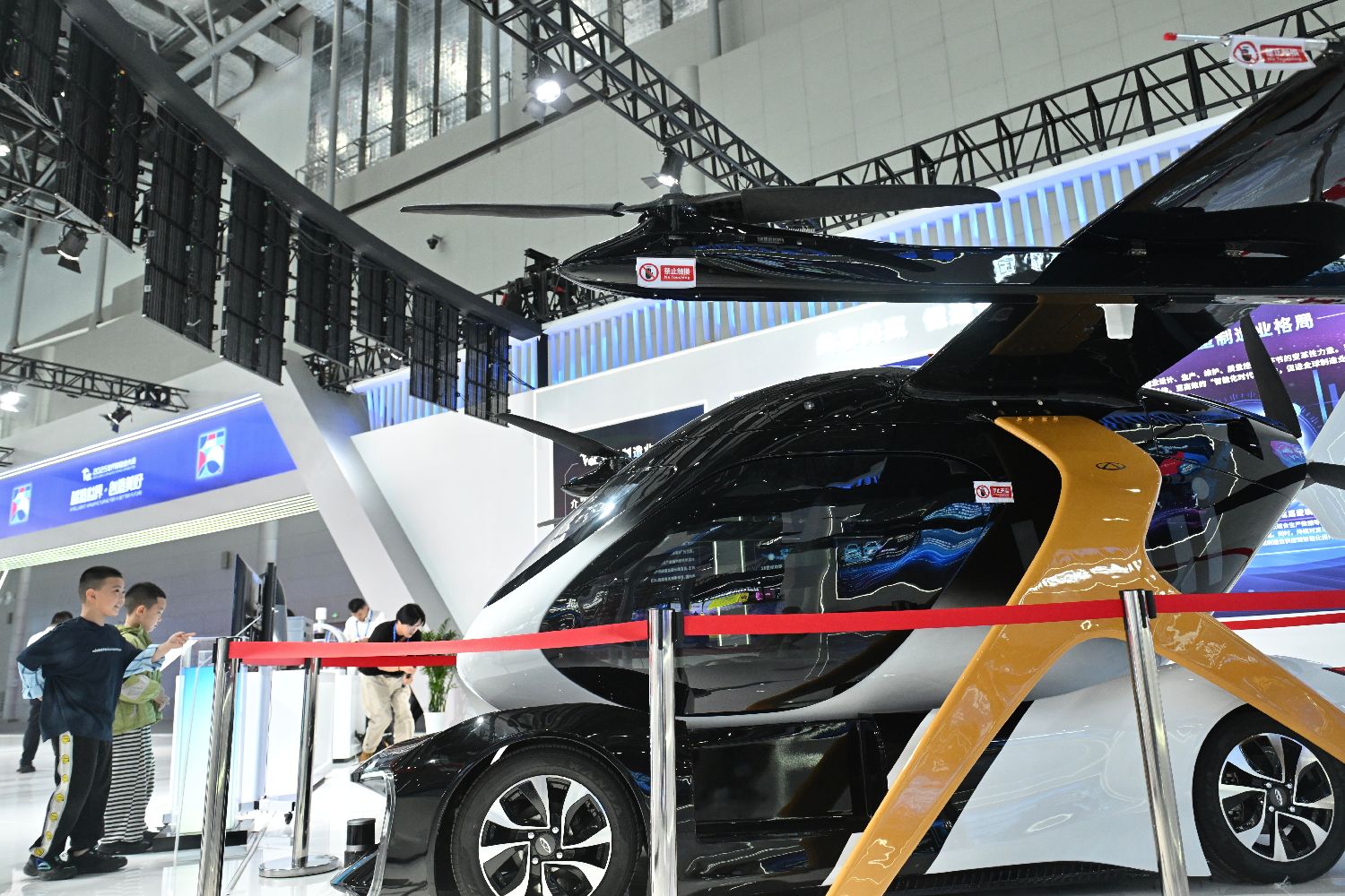 观众参观三体式复合翼飞行汽车,该汽车可实现陆空无人驾驶模式切换,助力解决城市交通拥堵问题。中新社