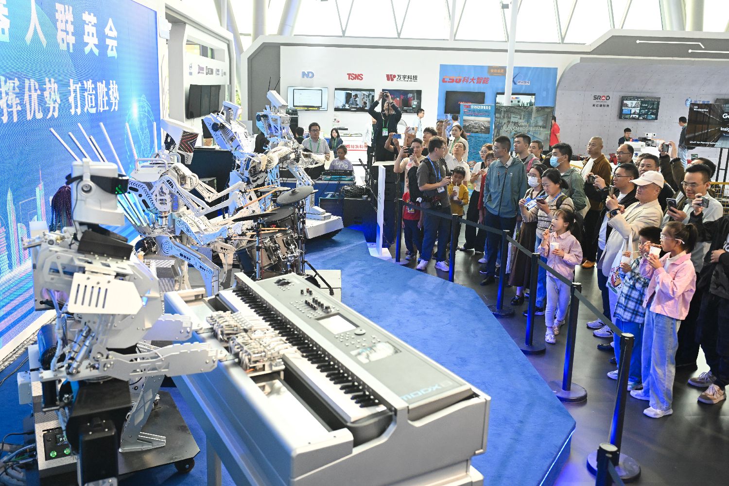 机器人乐队为现场观众演奏。 中新社