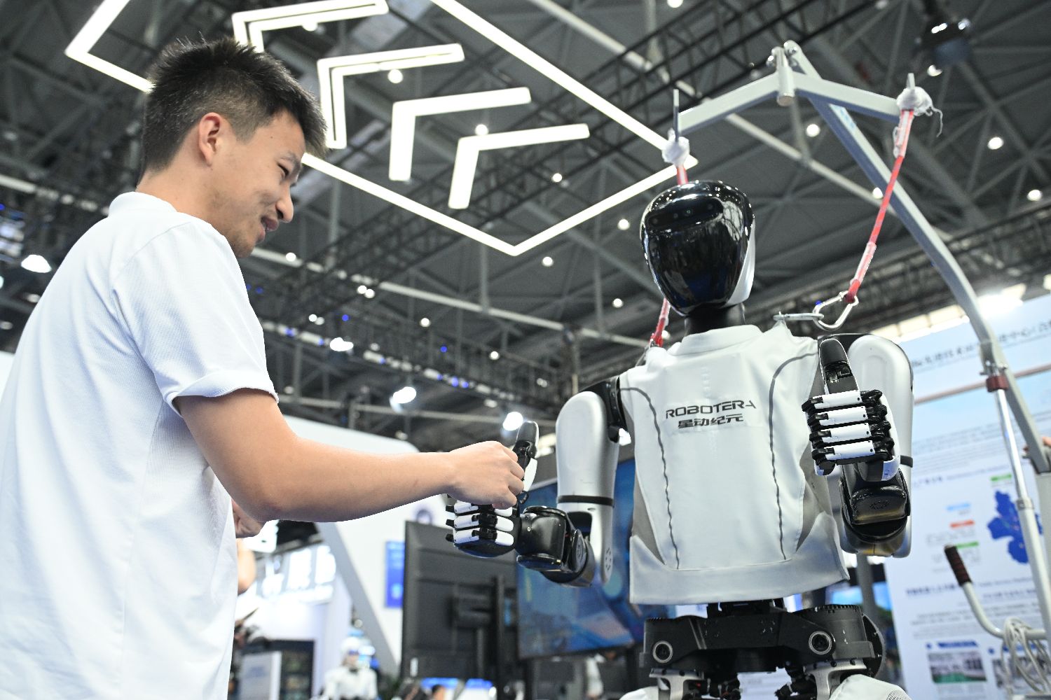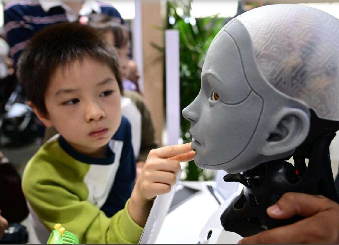 一位观众和人形机器人互动。中新社