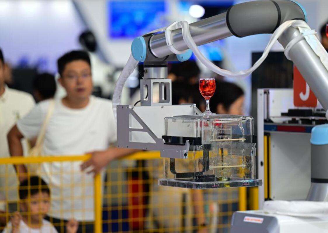 9月21日,在2025世界制造业大会智能机器人展区,一款工业机器人为观众演示拿放杯子。新华社