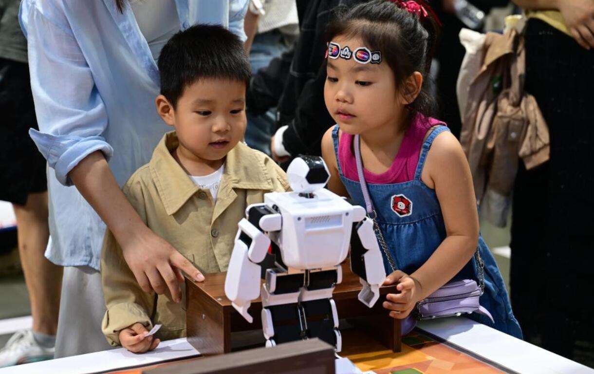 9月20日,小朋友在2025世界制造业大会智能机器人展区和一款机器人互动。新华社