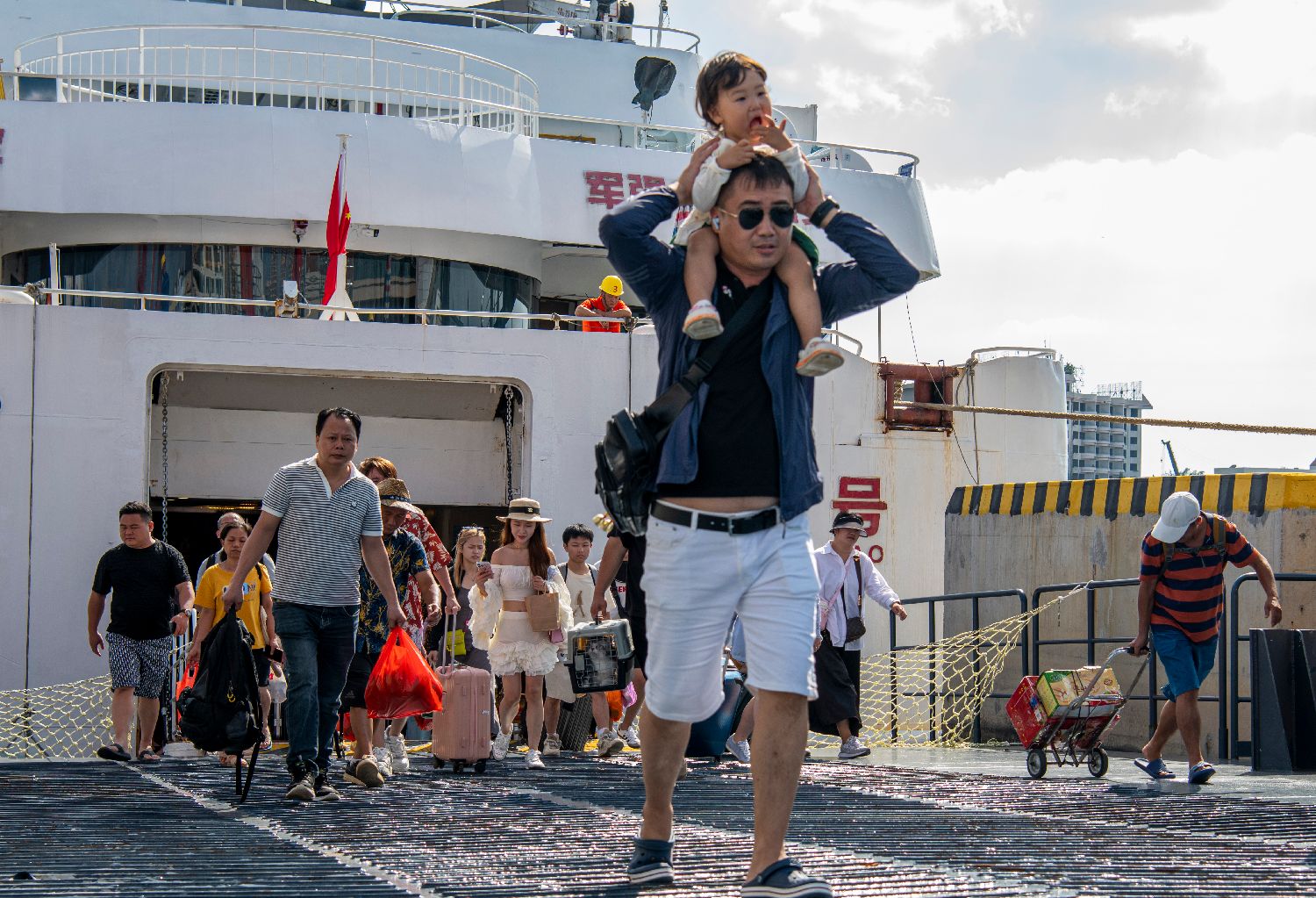 9月22日至23日,广西北海—涠洲岛航线共安排了12趟返程航班搭载民众离开涠洲岛,共售出8000余张离岛船票。受台风“桦加沙”影响,9月24日至25日北海至涠洲岛往返航班全天停航。图为9月23日,民众搭乘当天的最后一班游船从北海涠洲岛撤离,抵达北海国际客运港。中新社