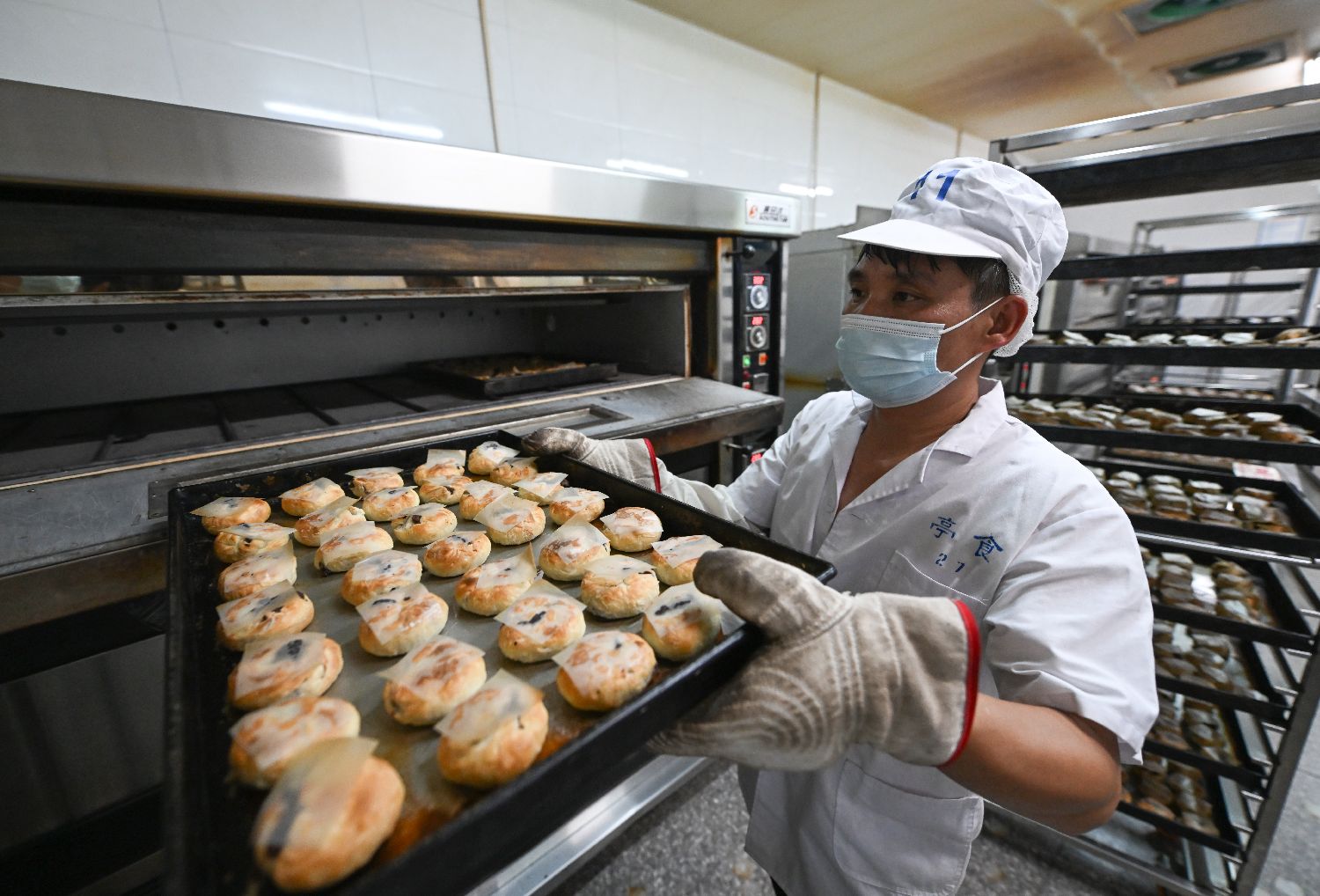 随着中国传统节日中秋佳节渐近,浙江杭州临平亭趾月饼受到消费者青睐,工人们加班制作,每天生产7万多个月饼发往各地,供应中秋订单高峰。据了解亭趾月饼已传承七十余年,以其传统的手工制作技艺和酥香口感吸引消费者。图为9月19日,工作人员拿出烤熟的手工月饼。中新社