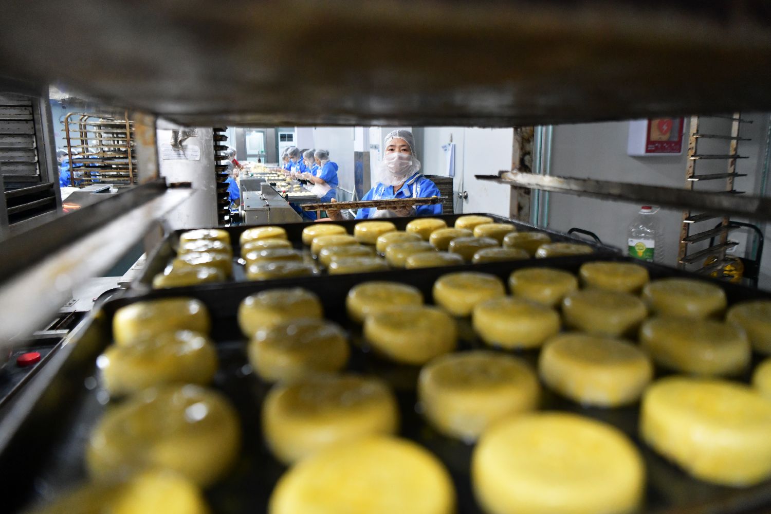 9月24日,在河北邯郸市肥乡区一家食品企业的糕点加工车间,工作人员在制作“蛋月烧”月饼。新华社