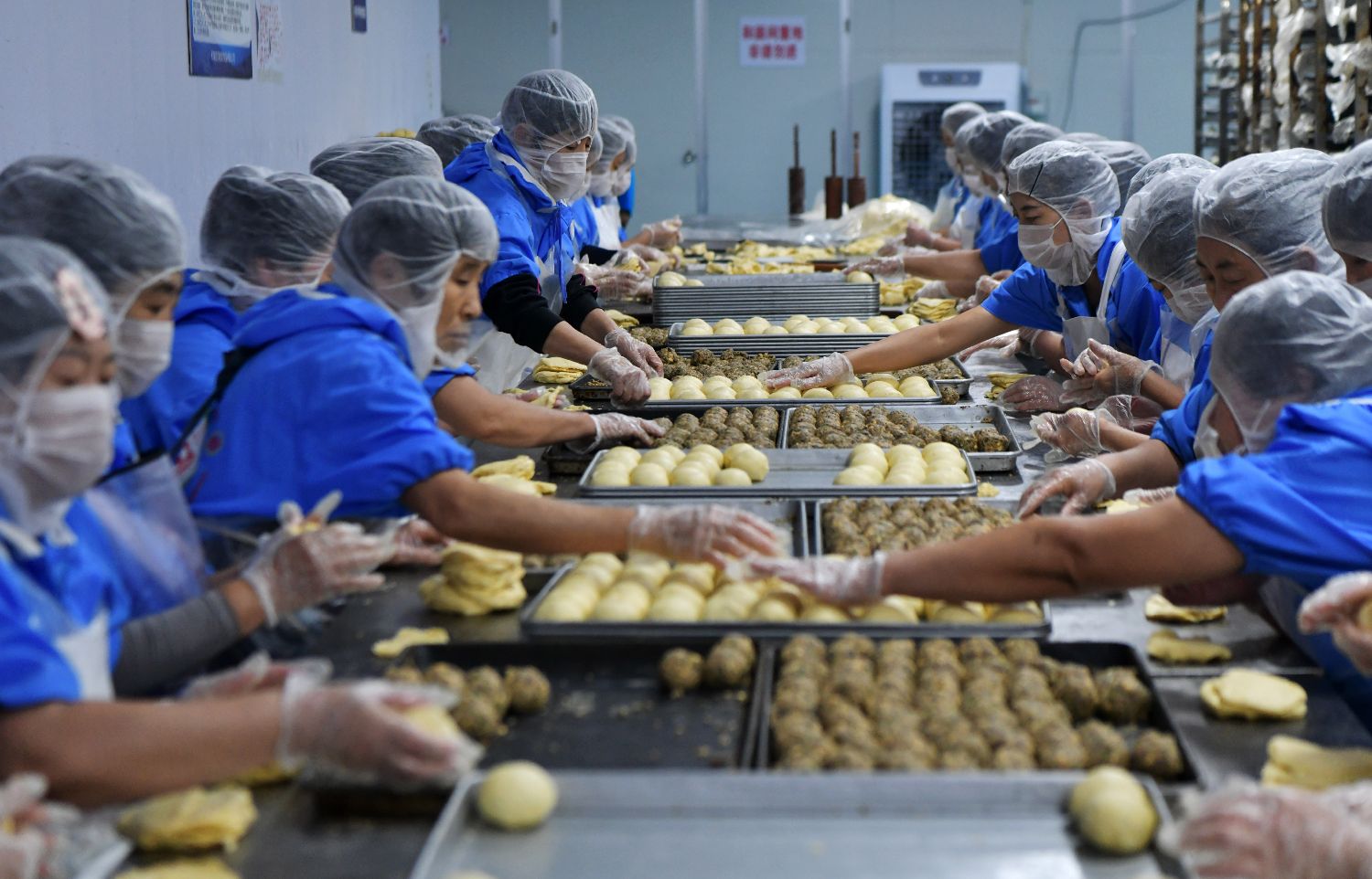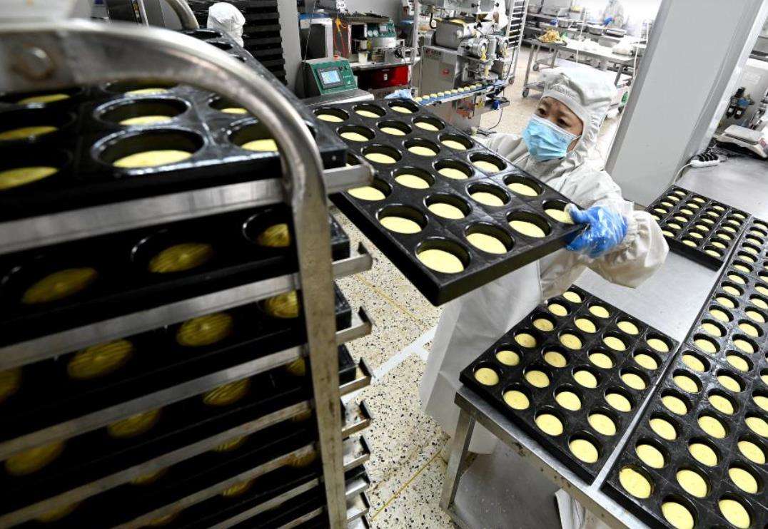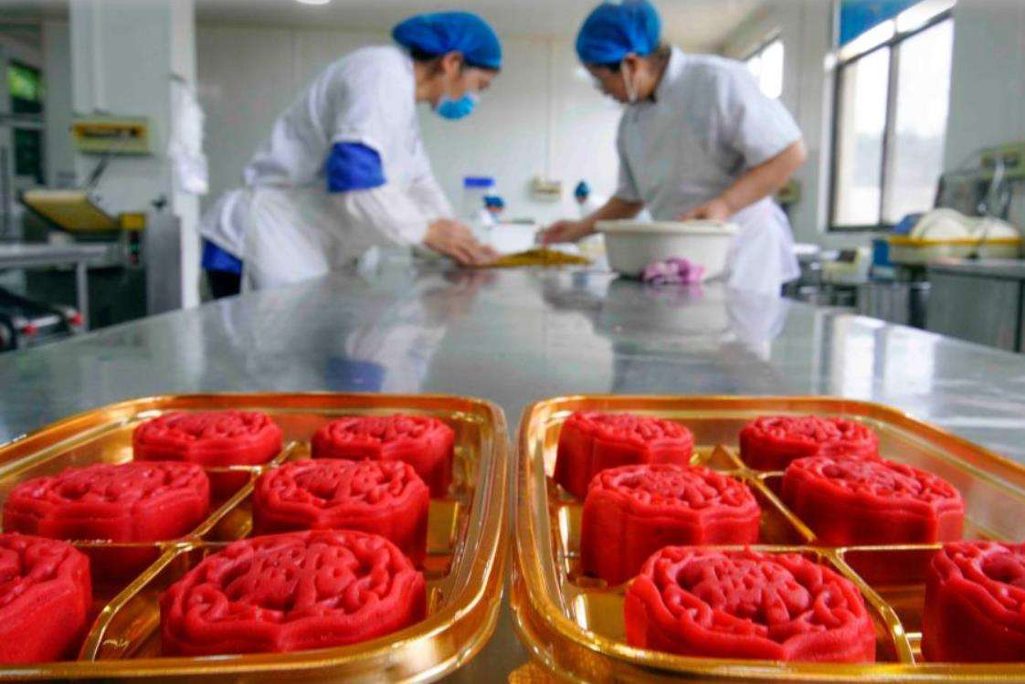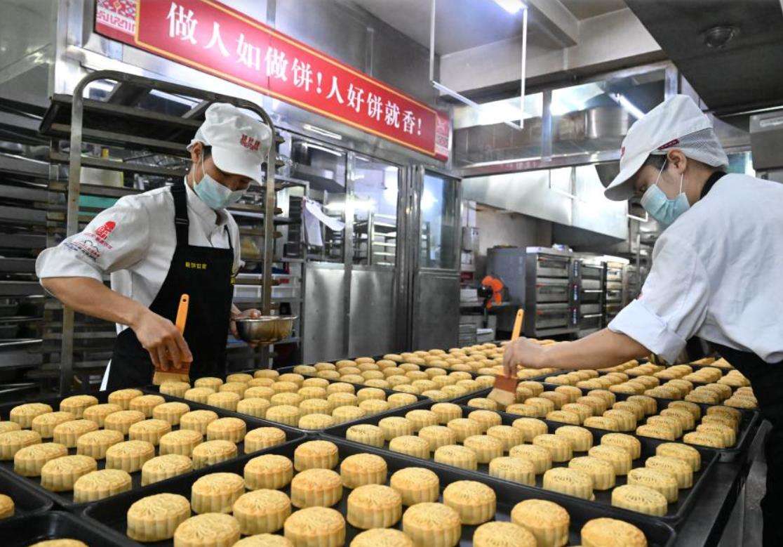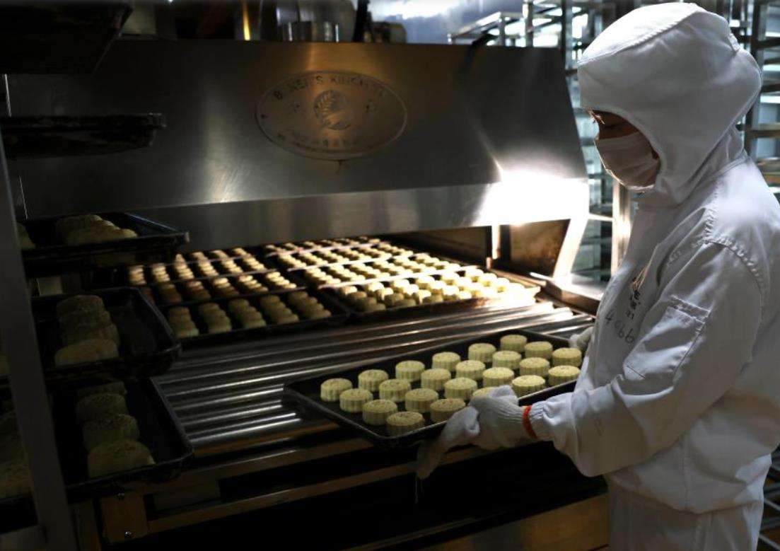 9月22日,在河北秦皇岛市海港区东港镇的秦皇岛宝圆斋食品有限公司,工人赶制月饼订单。新华社