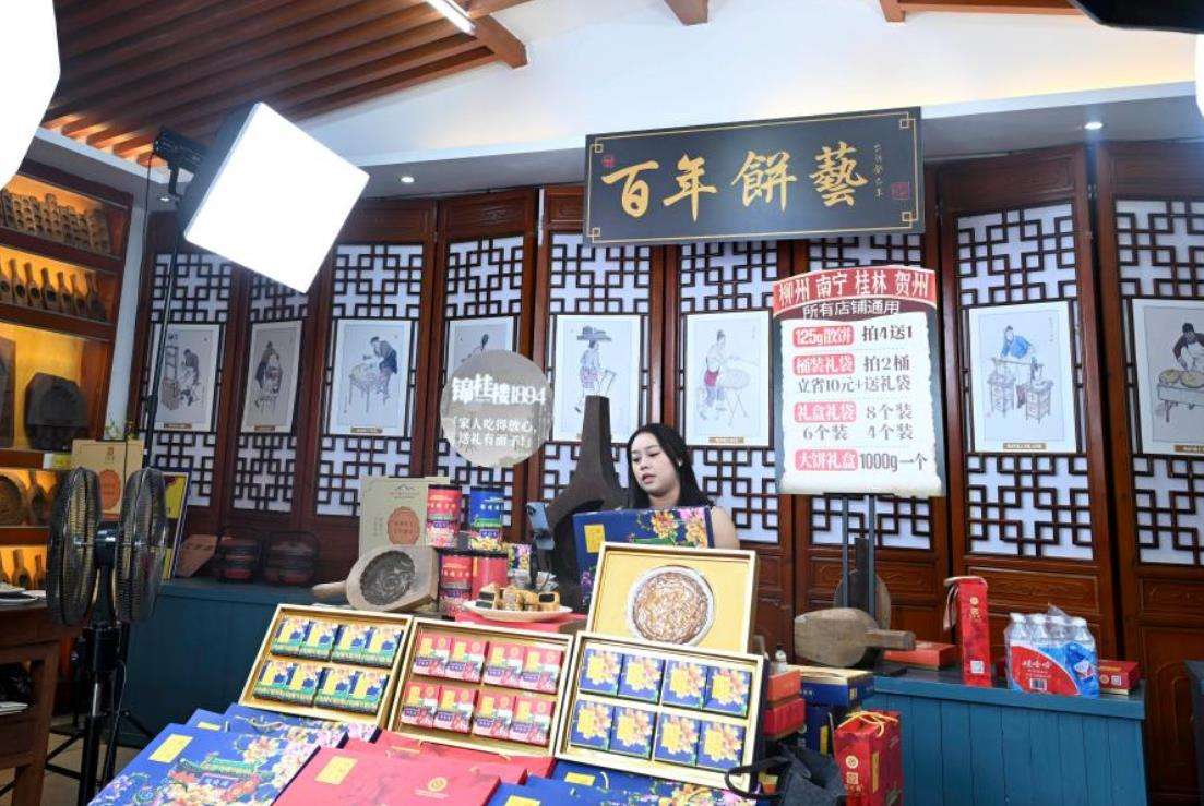 9月22日,在广西柳州市一家百年糕点企业里,主播在车间外直播销售月饼。新华社