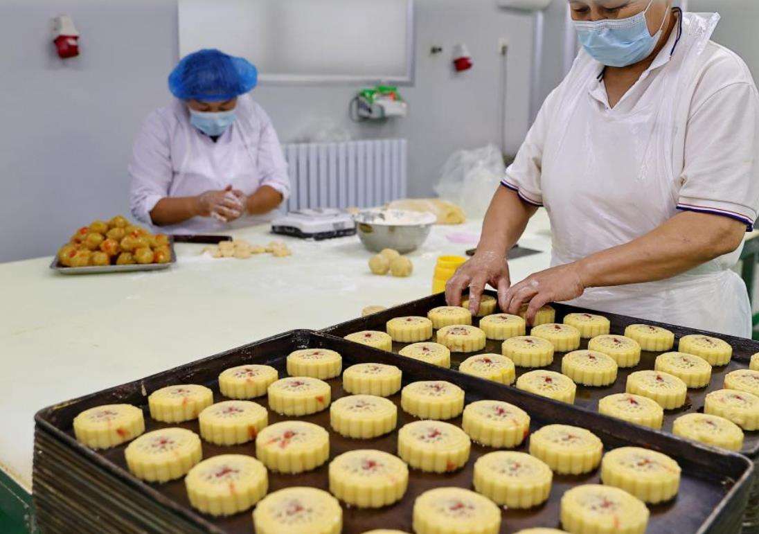 9月23日,在河北遵化市西三里镇一家糕点加工企业,工人在车间制作传统月饼。新华社