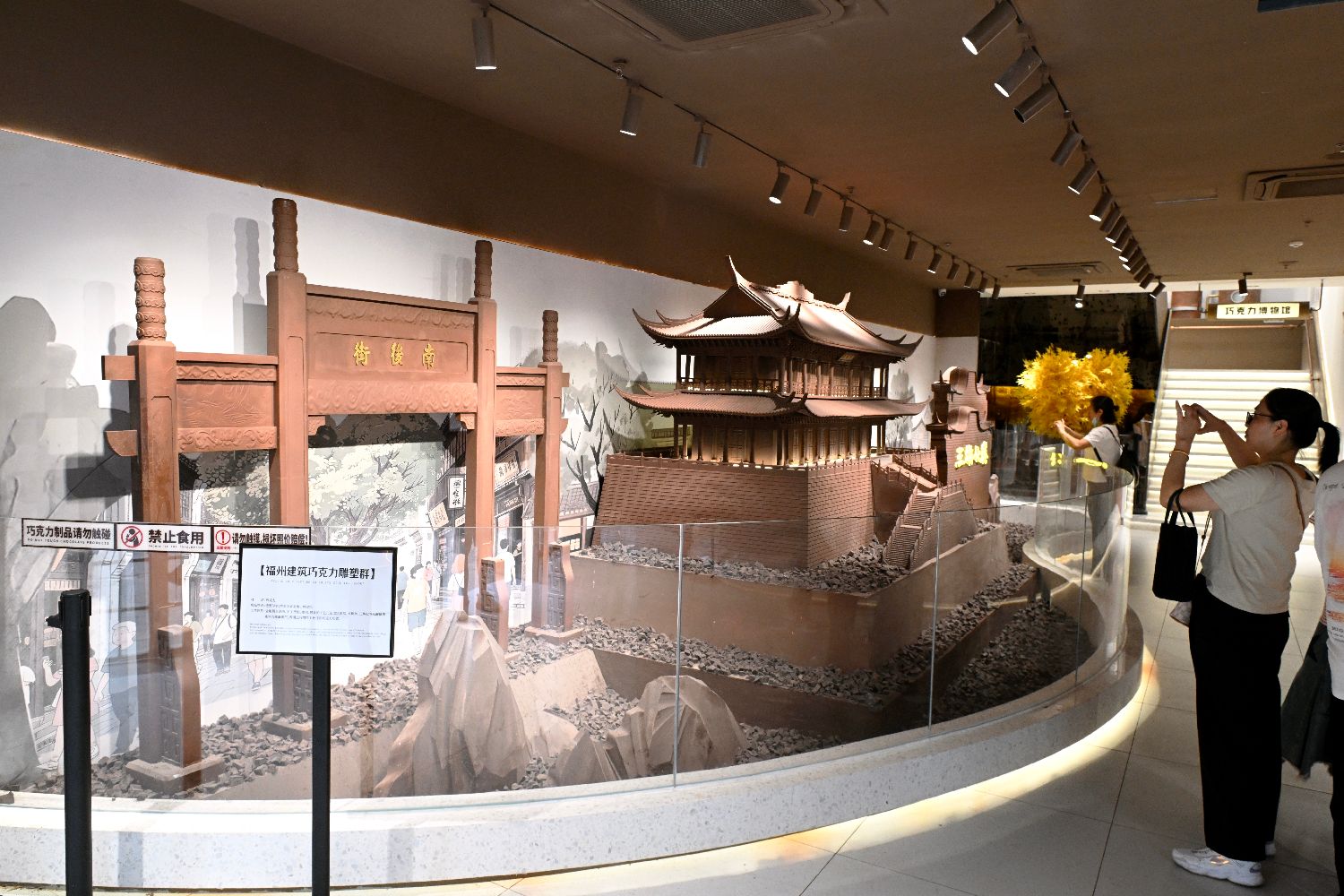 位于福州三坊七巷的巧克力博物馆展示了用10吨巧克力制作的各类雕塑,包括福州传统建筑、恐龙化石、海洋生物、古典人物等,吸引不少市民、游客前去参观。图为9月25日,游客在巧克力博物馆参观。中新社