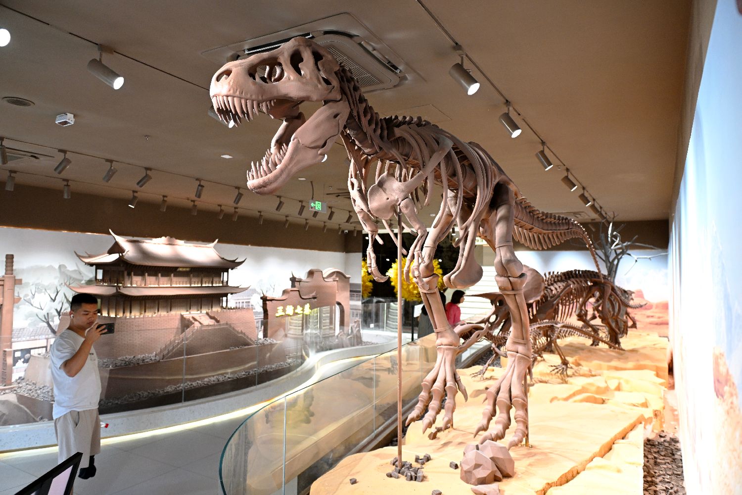 9月25日,游客观看恐龙造型的巧克力雕塑并拍照。中新社