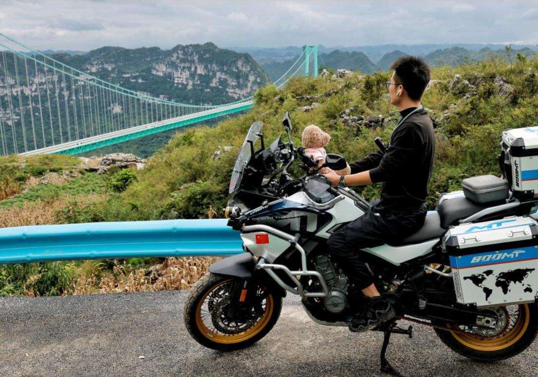 9月27日,一名摩托车爱好者在参观大桥。新华社