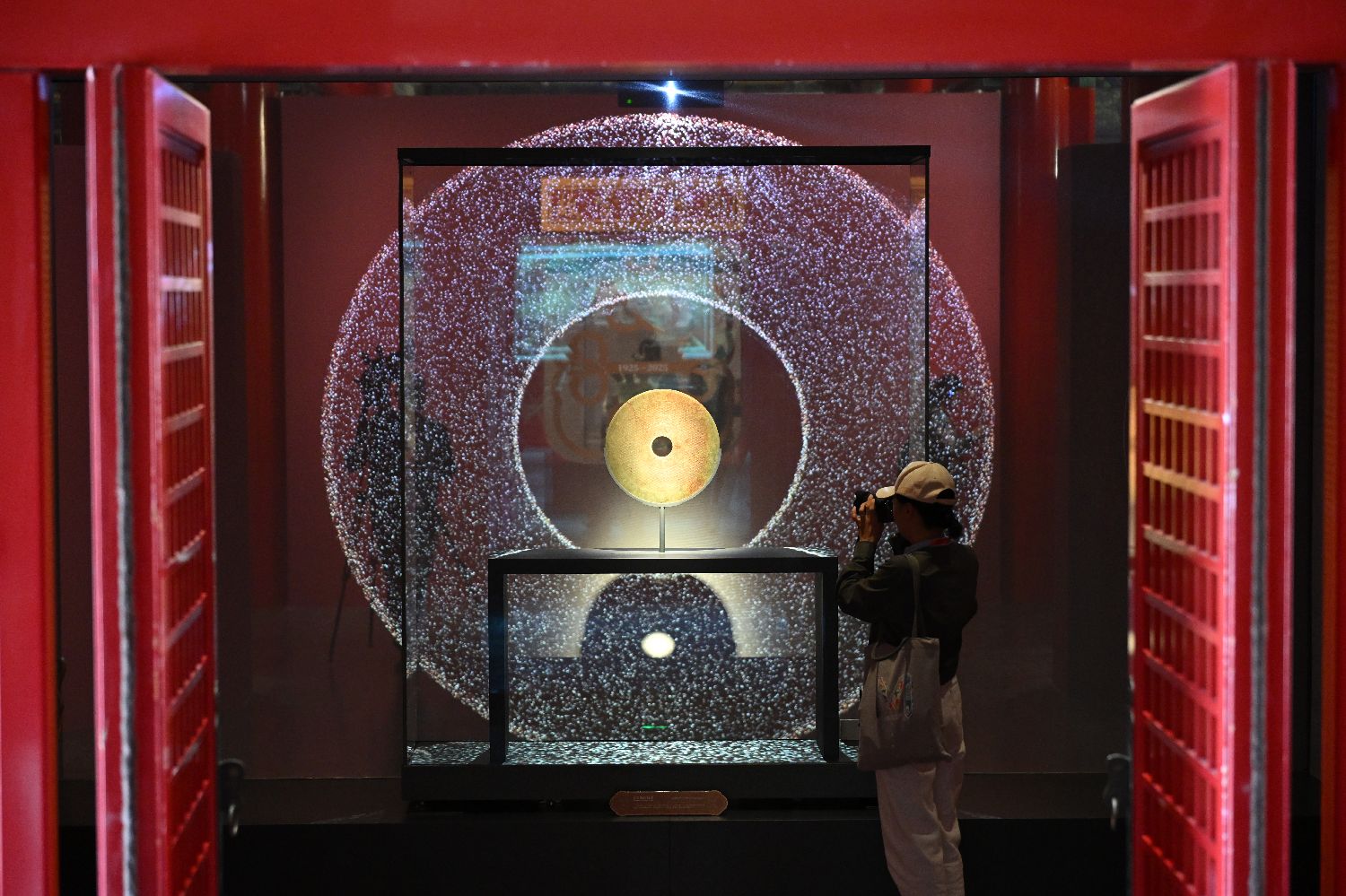 参观者拍摄青玉兽面纹壁(战国晚期至西汉早期)。中新社