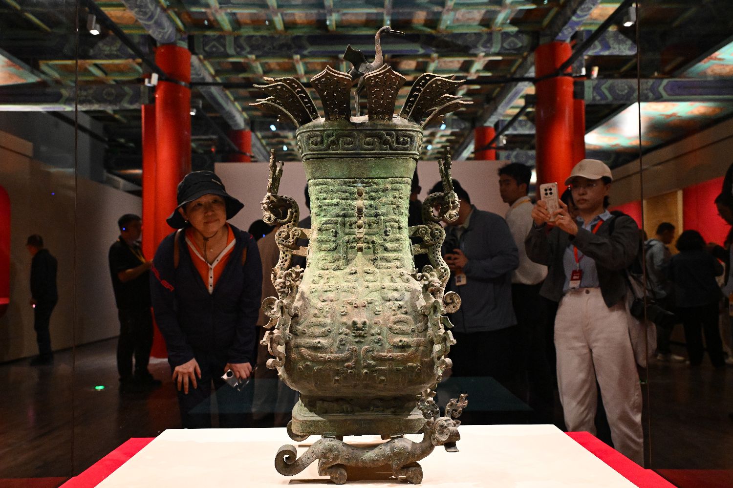 观众参观、拍摄春秋时期的青铜莲鹤方壶。中新社