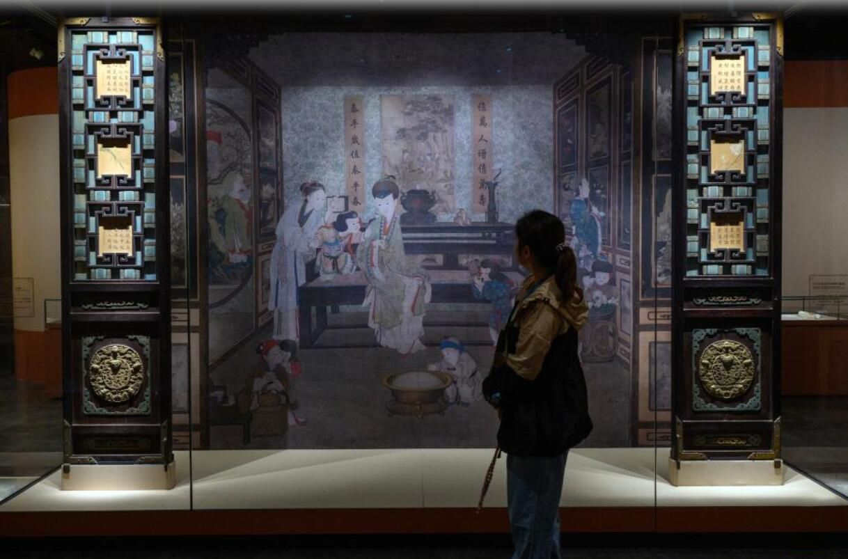 9月29日,观众参观乐寿堂嵌珐琅书画屉心槅扇。新华社