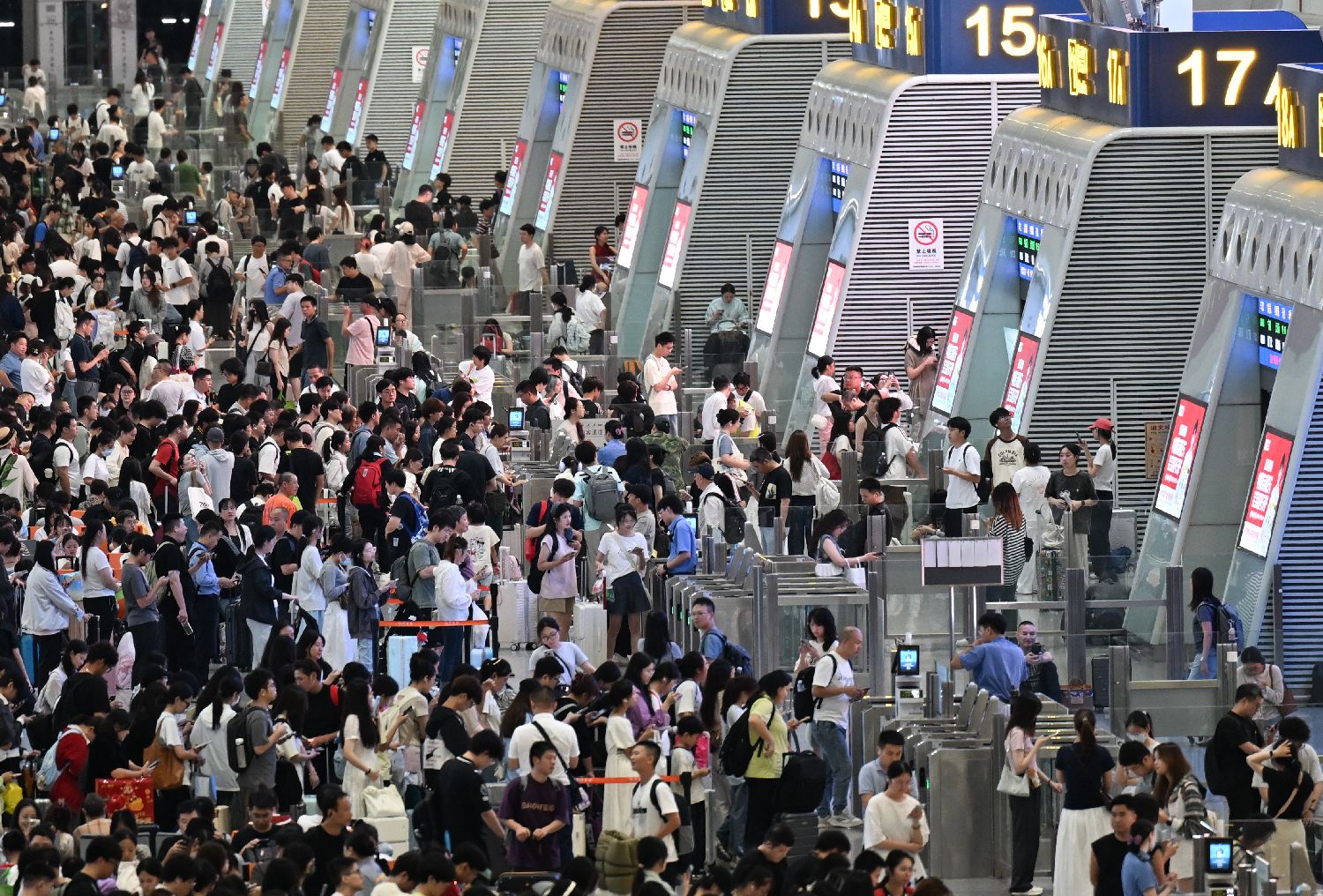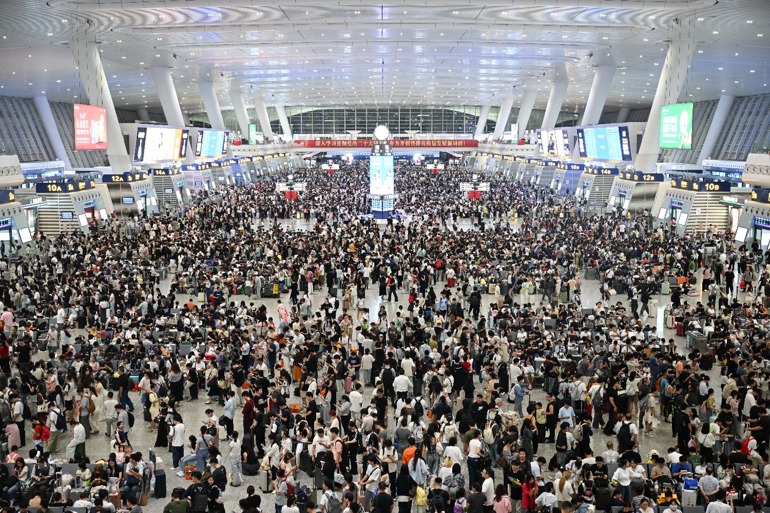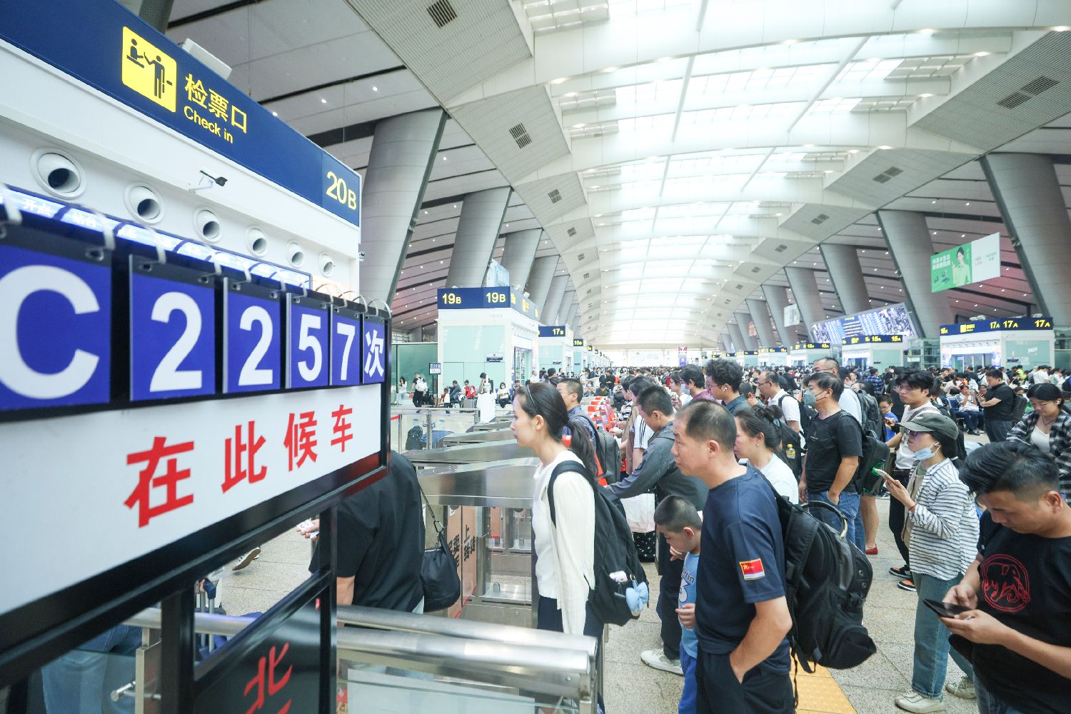 9月30日,大量旅客在杭州东站检票、换乘。当日,浙江杭州东站迎来十一、中秋双节客流高峰。该站于9月30日、10月1日、10月7日、10月8日开启通宵运营模式。中新社
