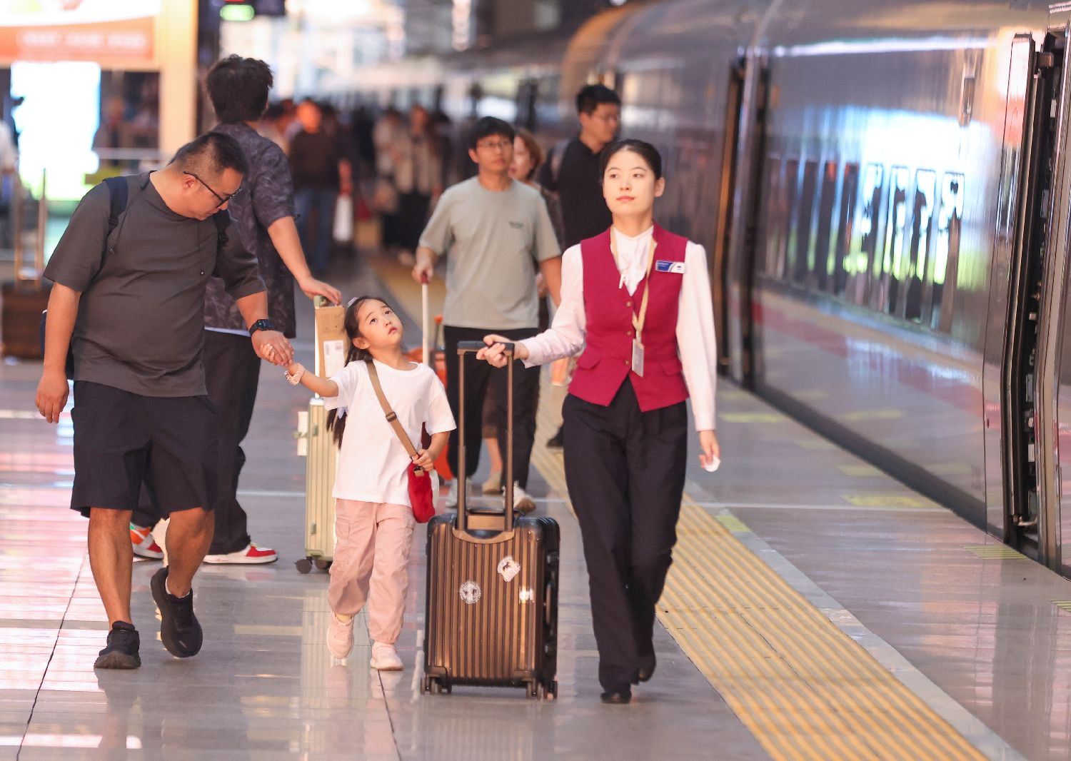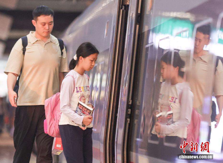 9月30日,小旅客带着小说在北京南站乘坐高铁列车。中新网