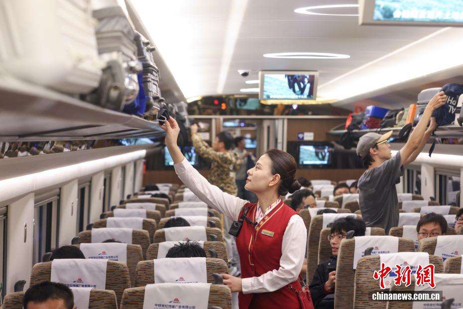9月30日,G211次列车在北京南站发车前,乘务员在满员的车厢内整理行李架。中新网