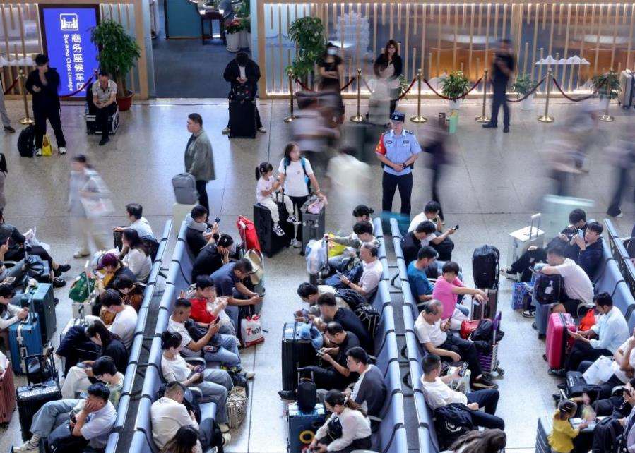 9月30日,大量旅客在杭州东站候车。中新社