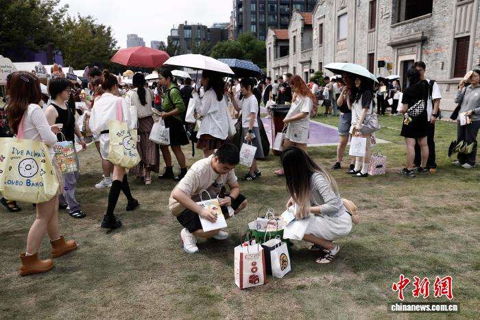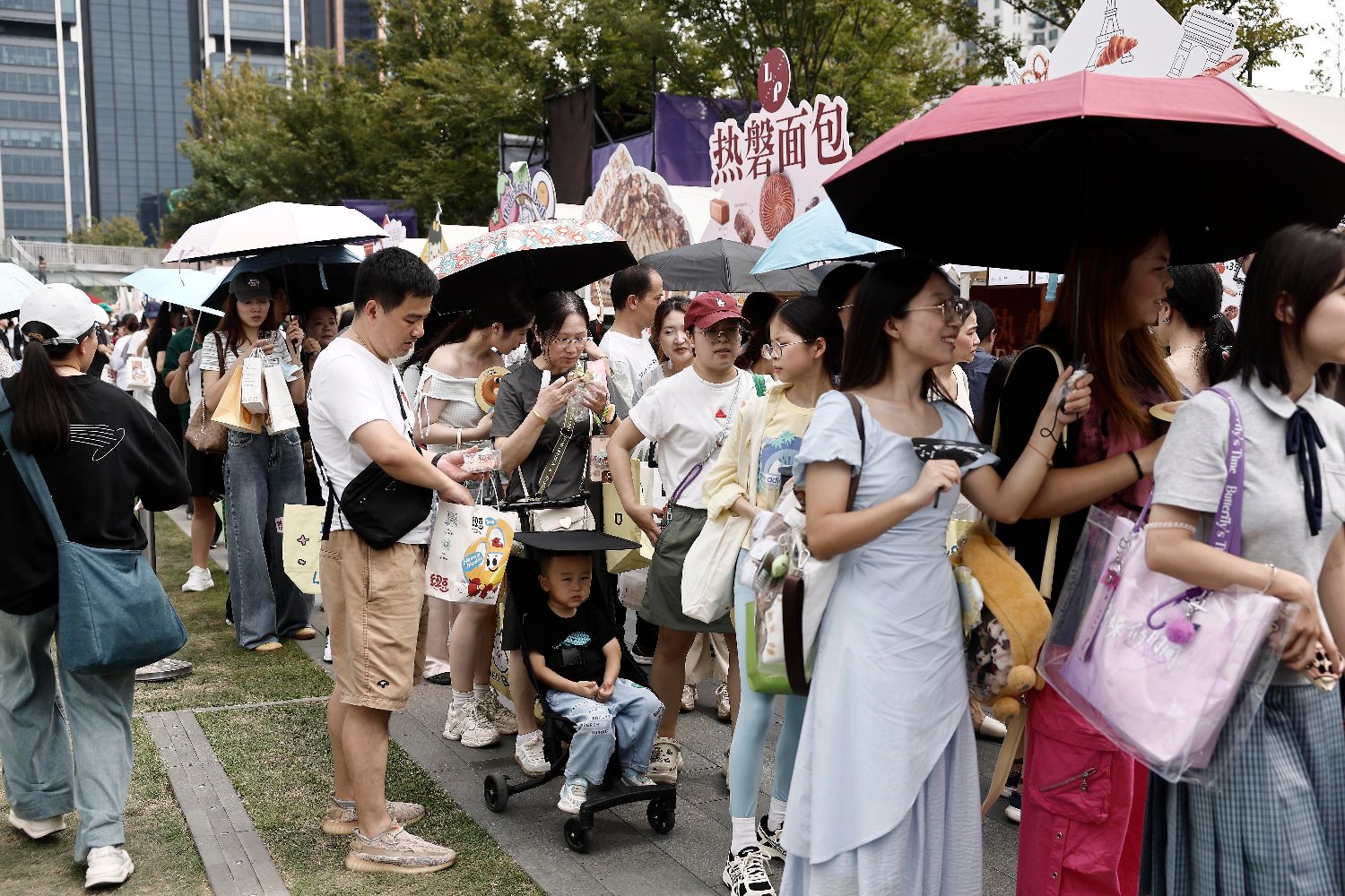 近日,“一起发酵吧”面包文化节在上海苏河湾万象天地慎余里广场举行,来自中国各地的优质面包品牌产品汇聚于此,方便市民品尝并选购。图为10月2日,市民排队等待购买面包。中新社