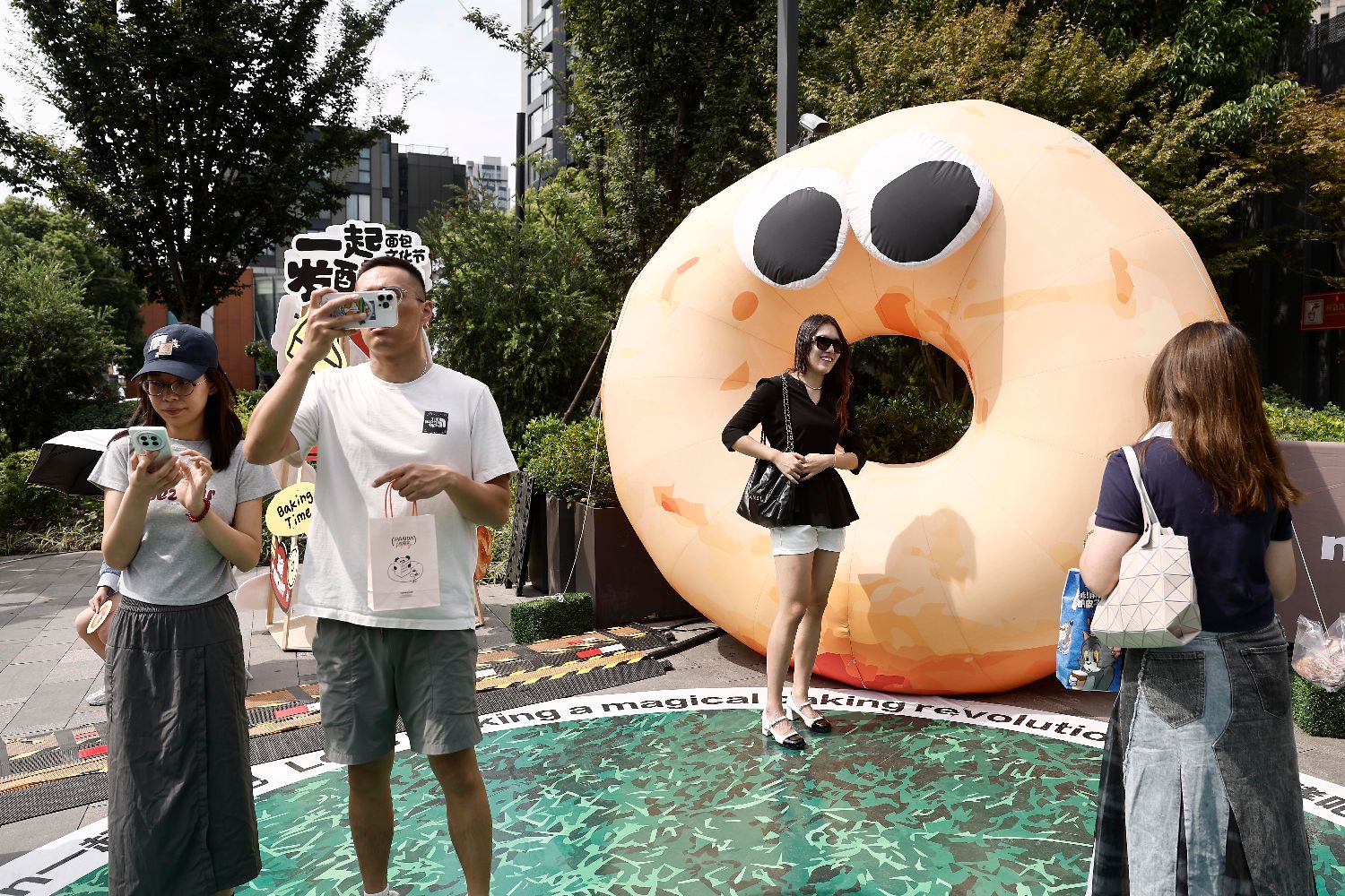 10月2日,市民在卡通面包装置前合影。中新社