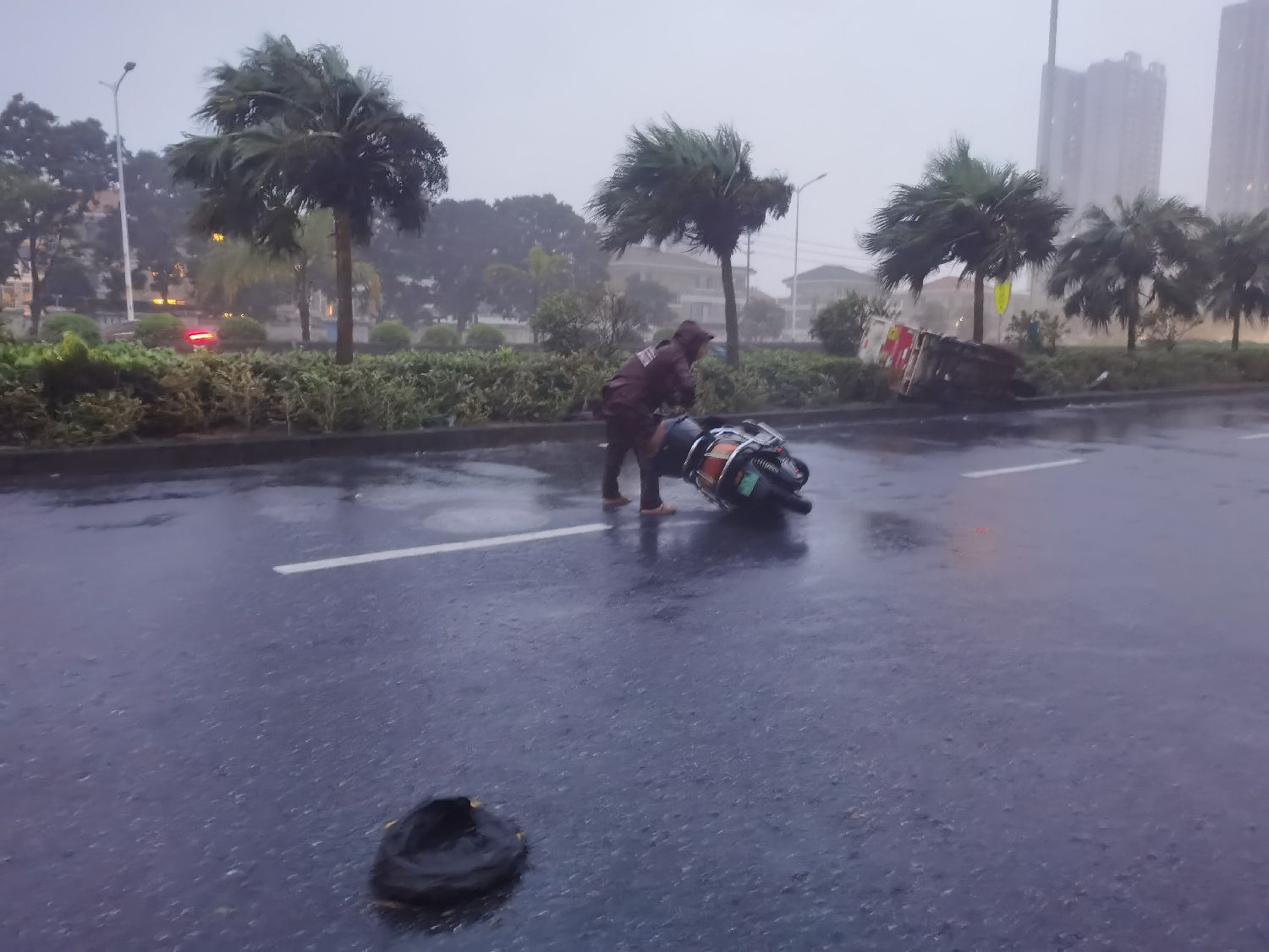 10月5日,海南海口滨海大道路边的多棵椰子树被大风吹倒。中新社