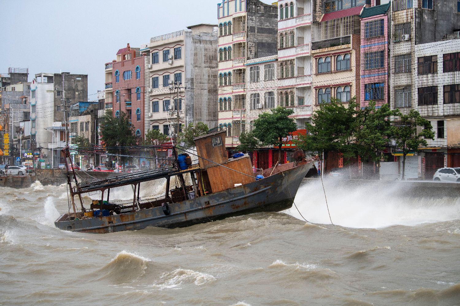 10月5日下午,受台风“麦德姆”影响,广西北海开始狂风骤雨,巨浪翻涌。北海市当天17时00分起,将防汛防台风三级应急响应提升为二级应急响应。图为被吹翻的车辆。中新社