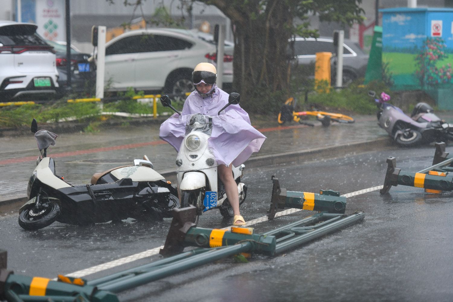 10月5日,海南海口,一女子骑电动车在强风雨中出行,多辆电动车被大风吹倒。中新社