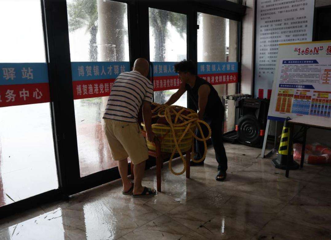 10月5日,在广东省茂名市电白区博贺渔港党群服务中心,工作人员用重物顶住房门。新华社