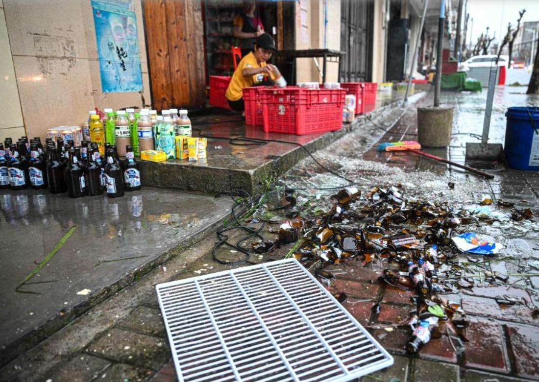 10月5日在海南省文昌市翁田镇一家商店外,啤酒瓶被台风吹倒打碎。新华社