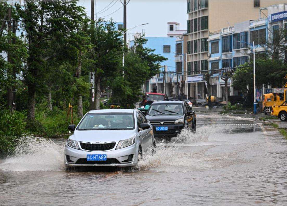 10月5日,车辆行驶在海南省文昌市翁田镇的一处积水路段。新华社