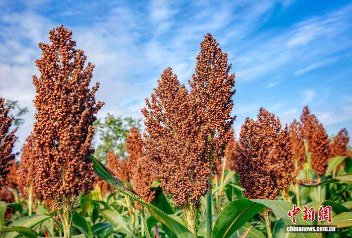 近日,山西省柳林县陈家湾镇的千亩红高粱种植基地迎来丰收。图为穗粒饱满、红透枝头的高粱。