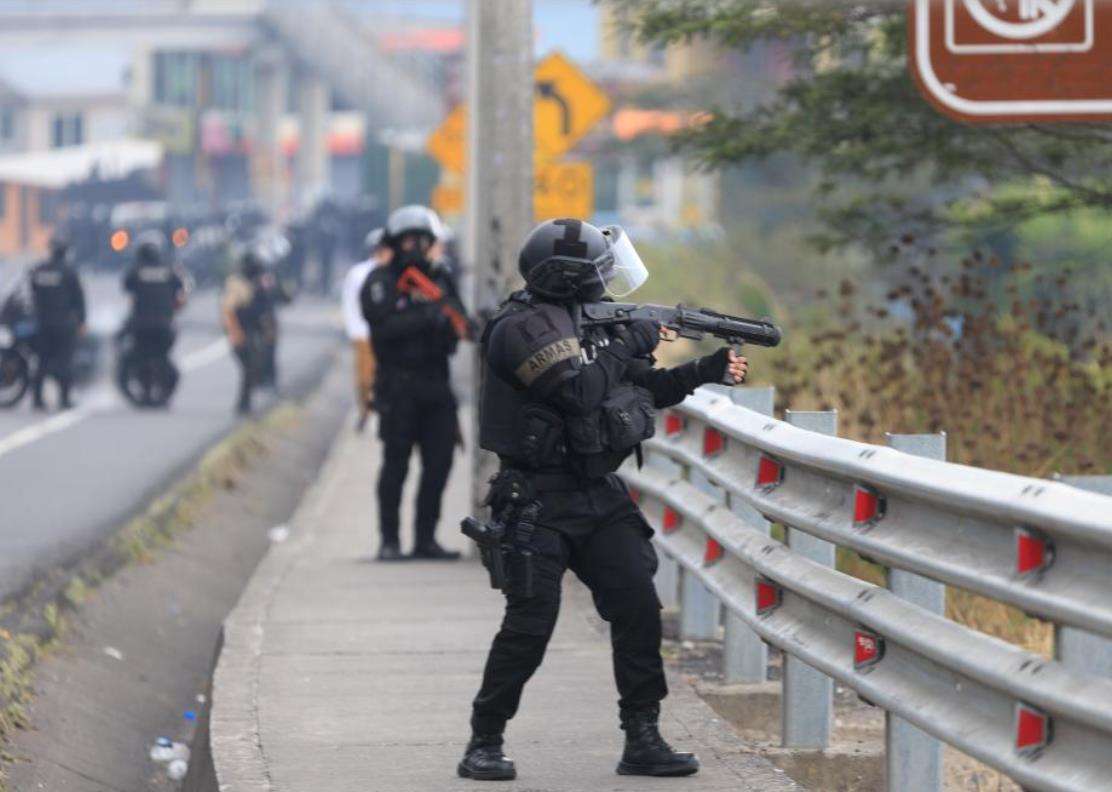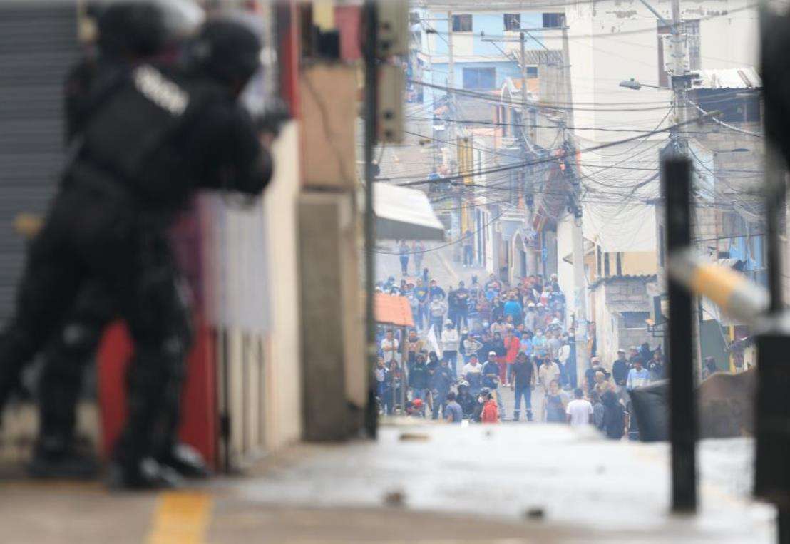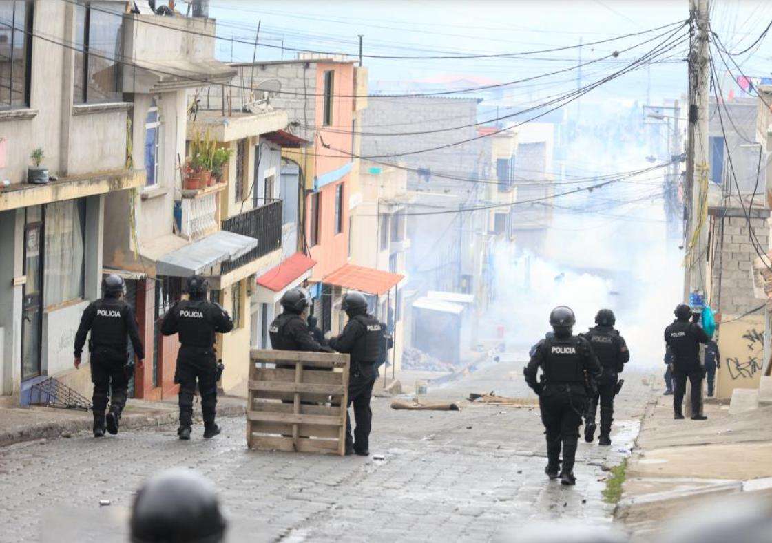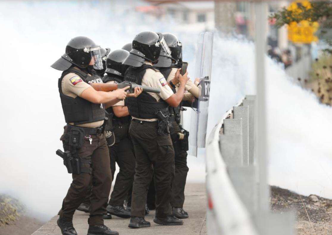 10月9日,在厄瓜多尔首都基多的北部郊区,武装警察与示威者对峙。