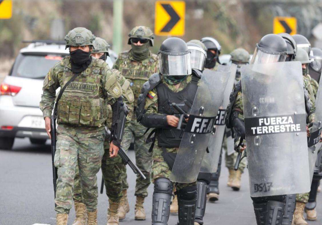 10月9日,在厄瓜多尔首都基多的北部郊区,武装警察在公路上执勤。