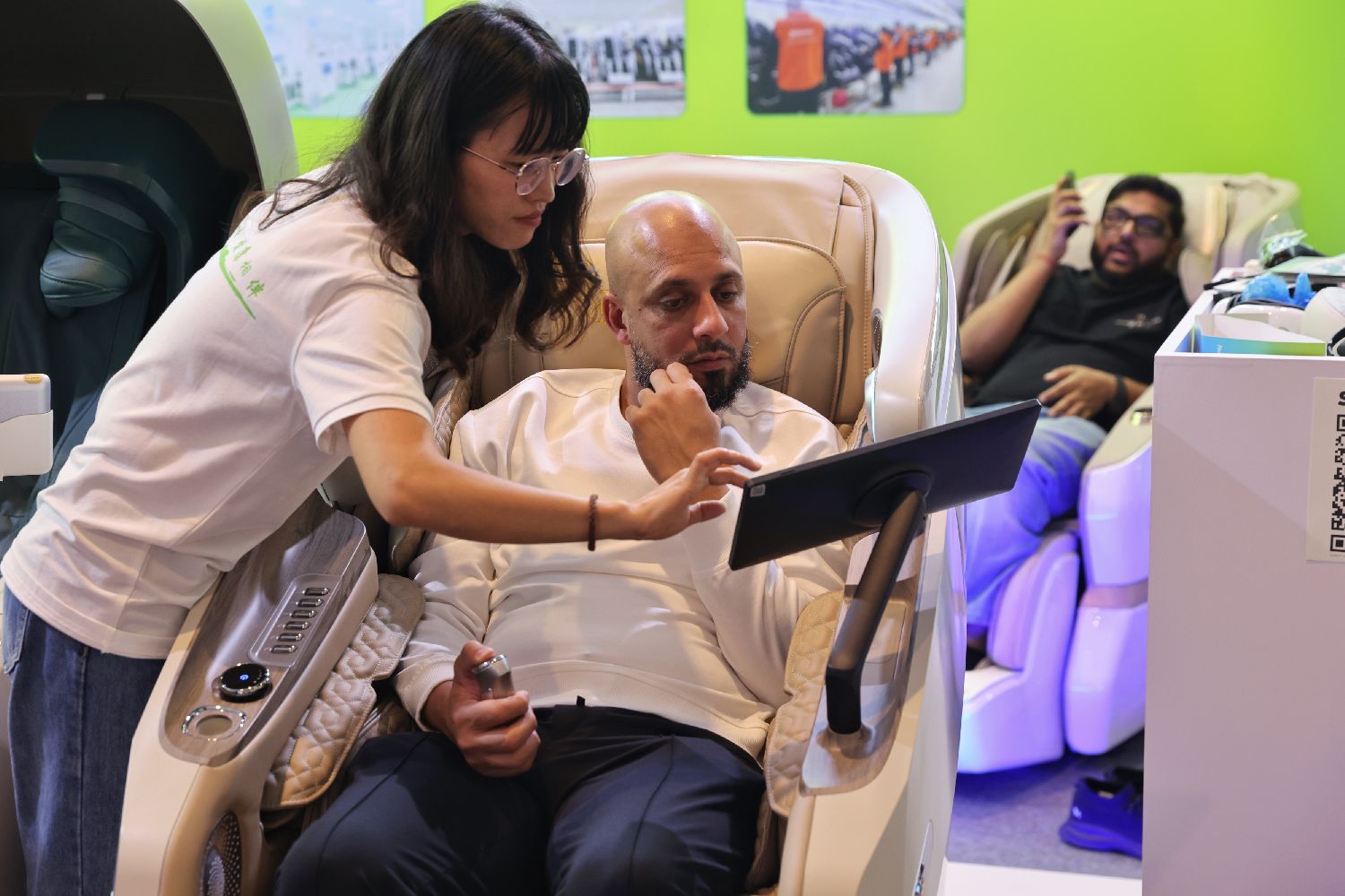 外国顾客体验智能按摩椅。香港中通社