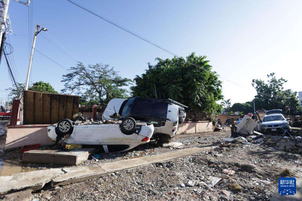 10月12日,在墨西哥韦拉克鲁斯州波萨里卡,被洪水冲毁的车辆叠落在路边。