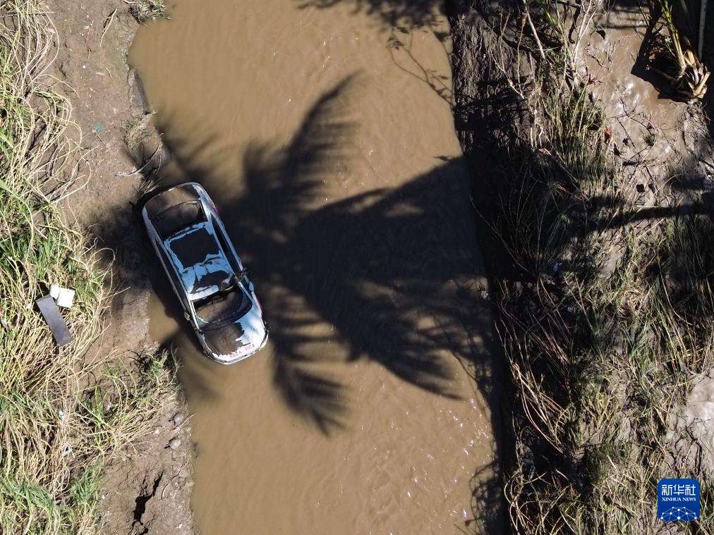 10月12日,在墨西哥韦拉克鲁斯州波萨里卡,一辆汽车陷在强降雨导致的积水中(无人机照片)。