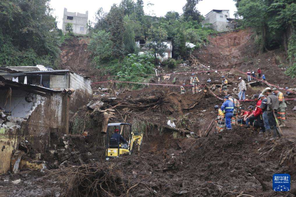 10月13日,在墨西哥普埃布拉州瓦乌奇南戈市,救援人员在强降雨引发的山体滑坡现场进行搜救。