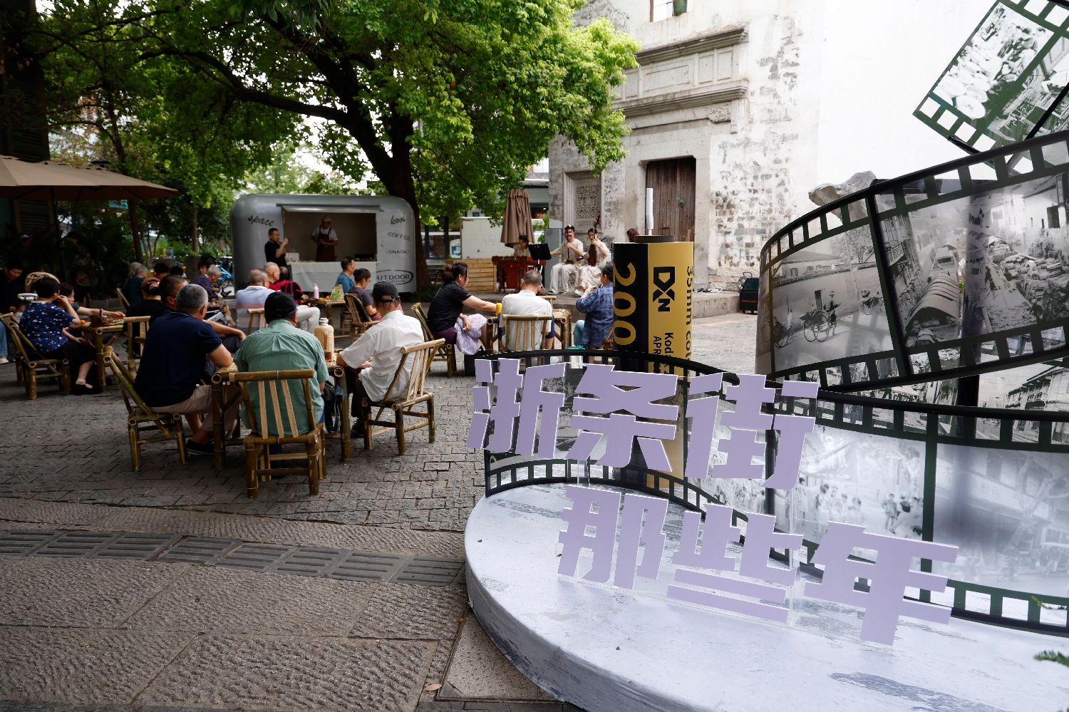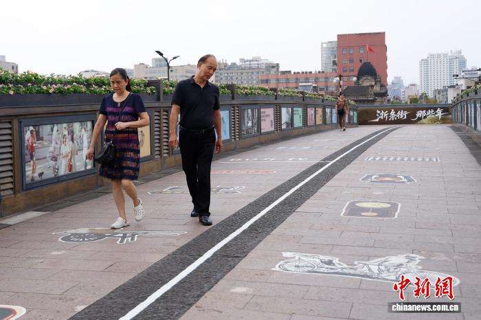 游人驻足欣赏路上的老物件贴纸。中新网