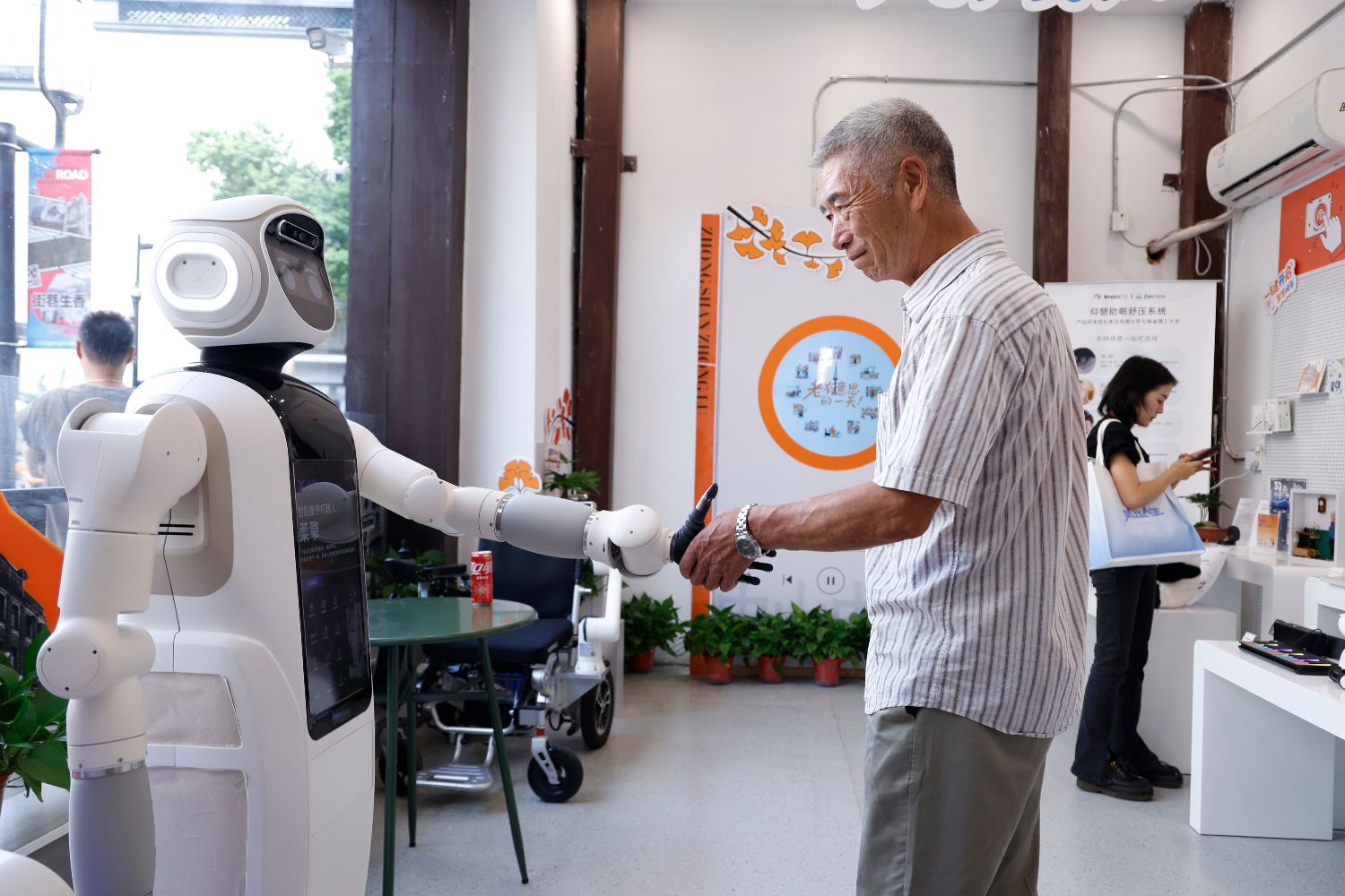 老人与智能康养机器人握手互动。中新社