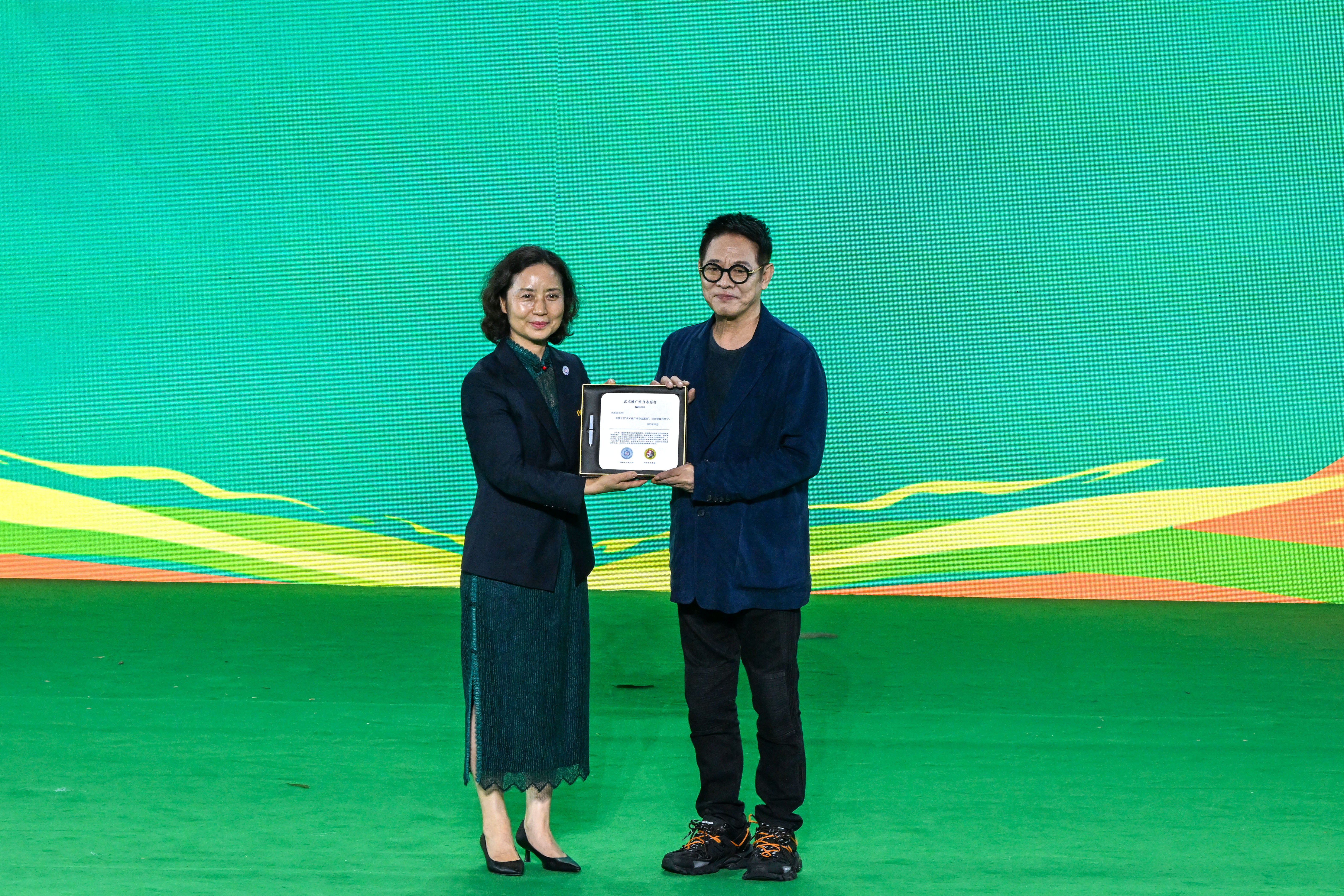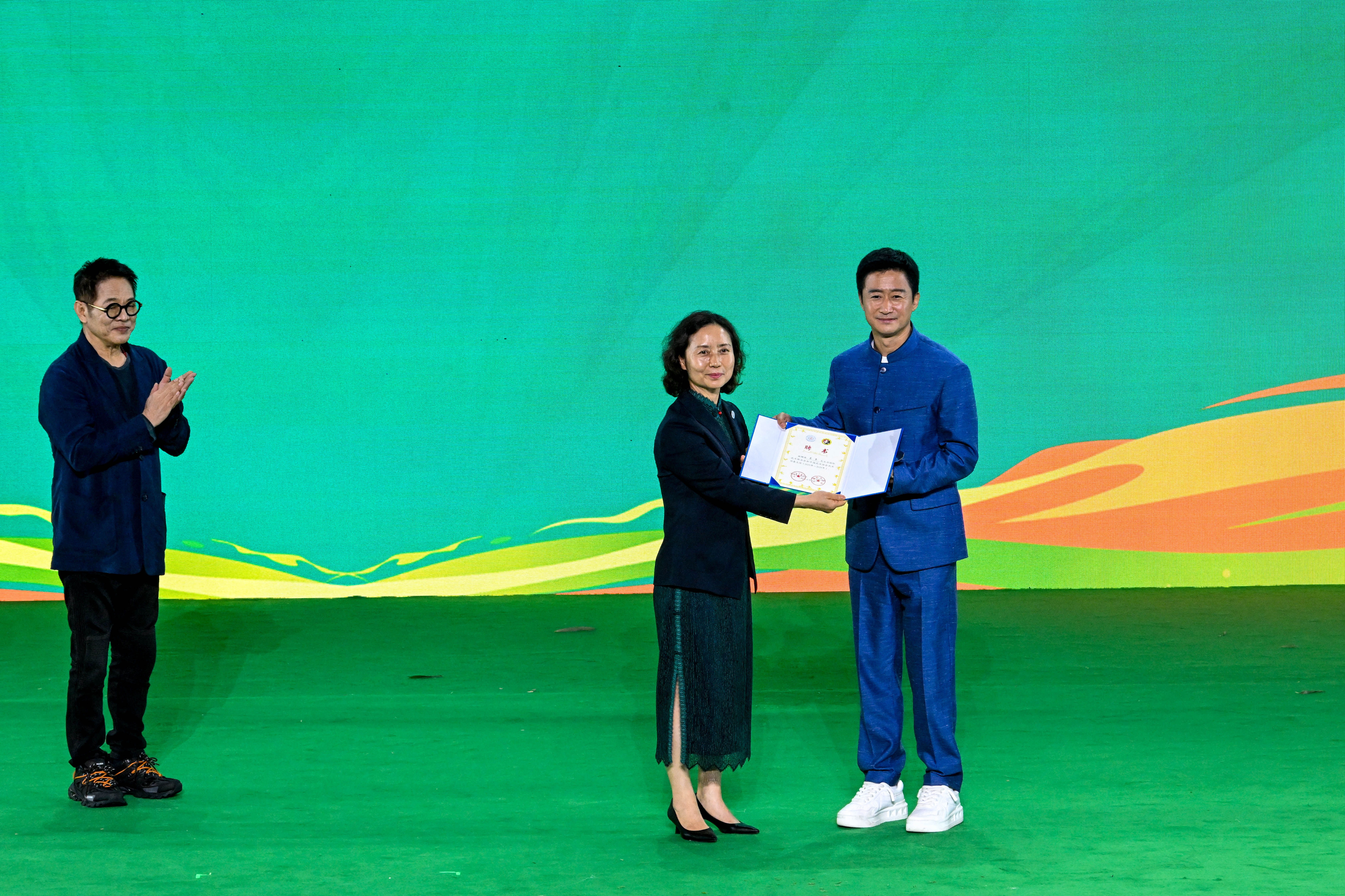 国际武术联合会秘书长张玉萍为知名演员吴京颁发“国际武术联合会和中国武术协会武术形象大使”聘书。中新社