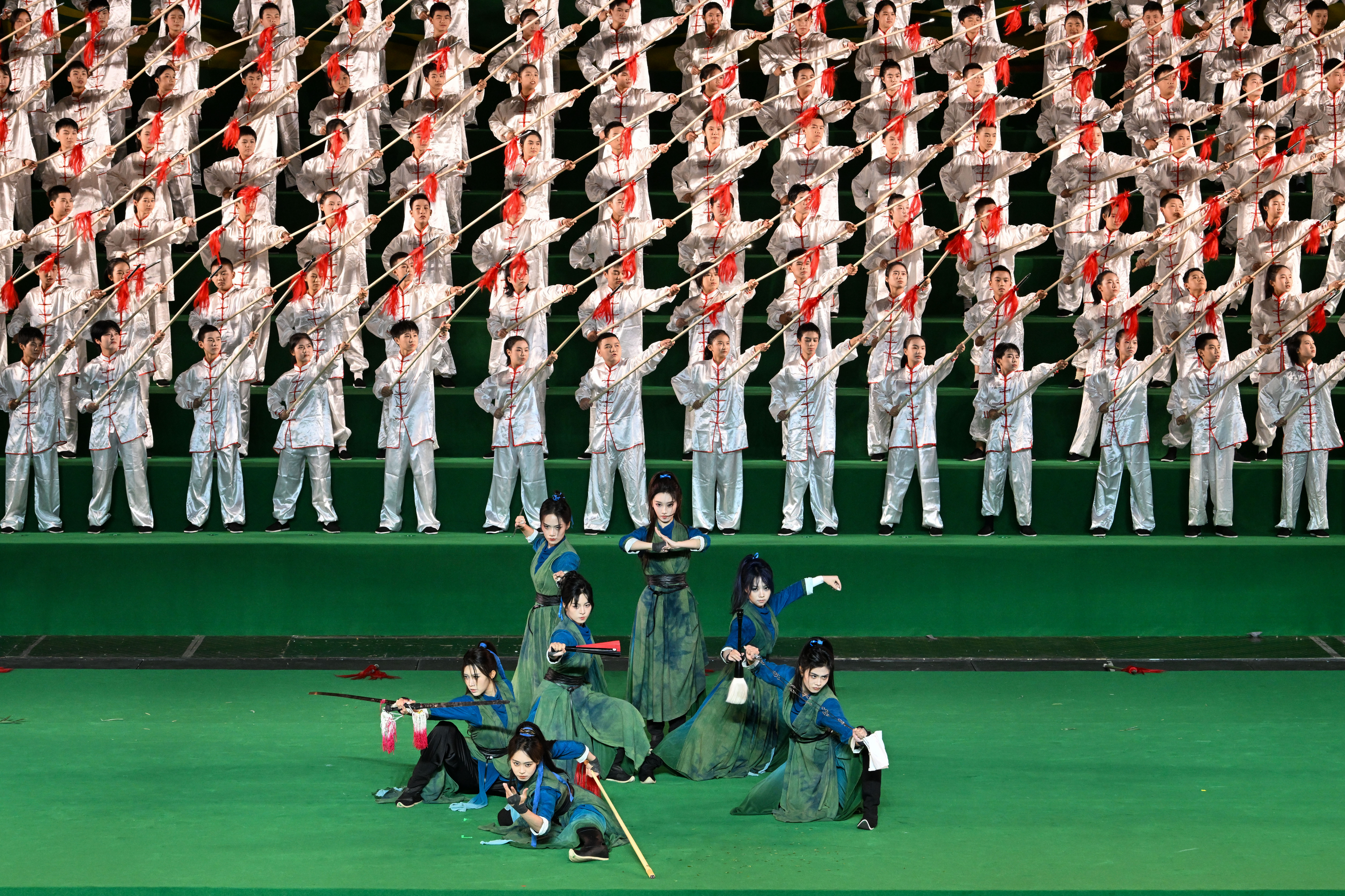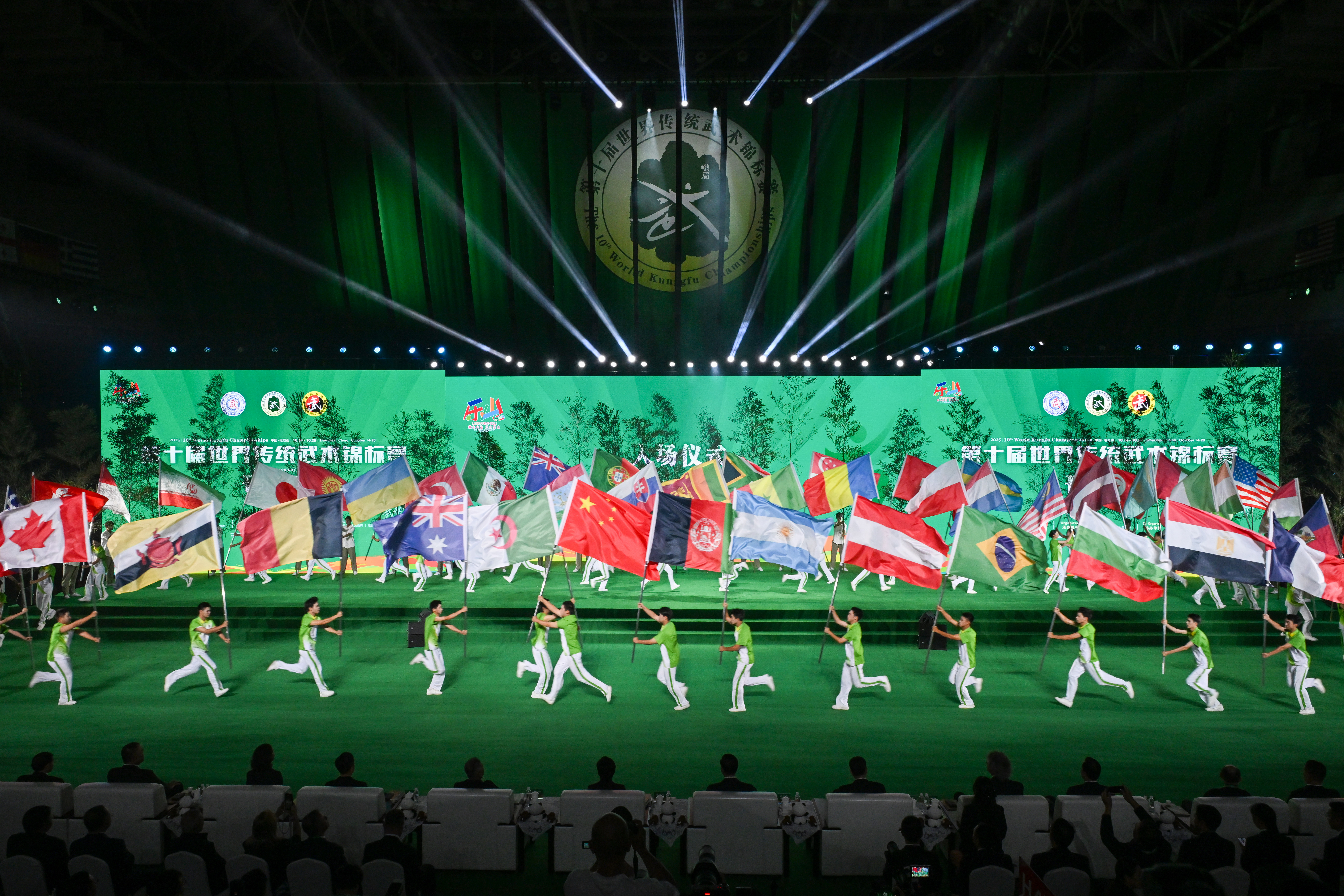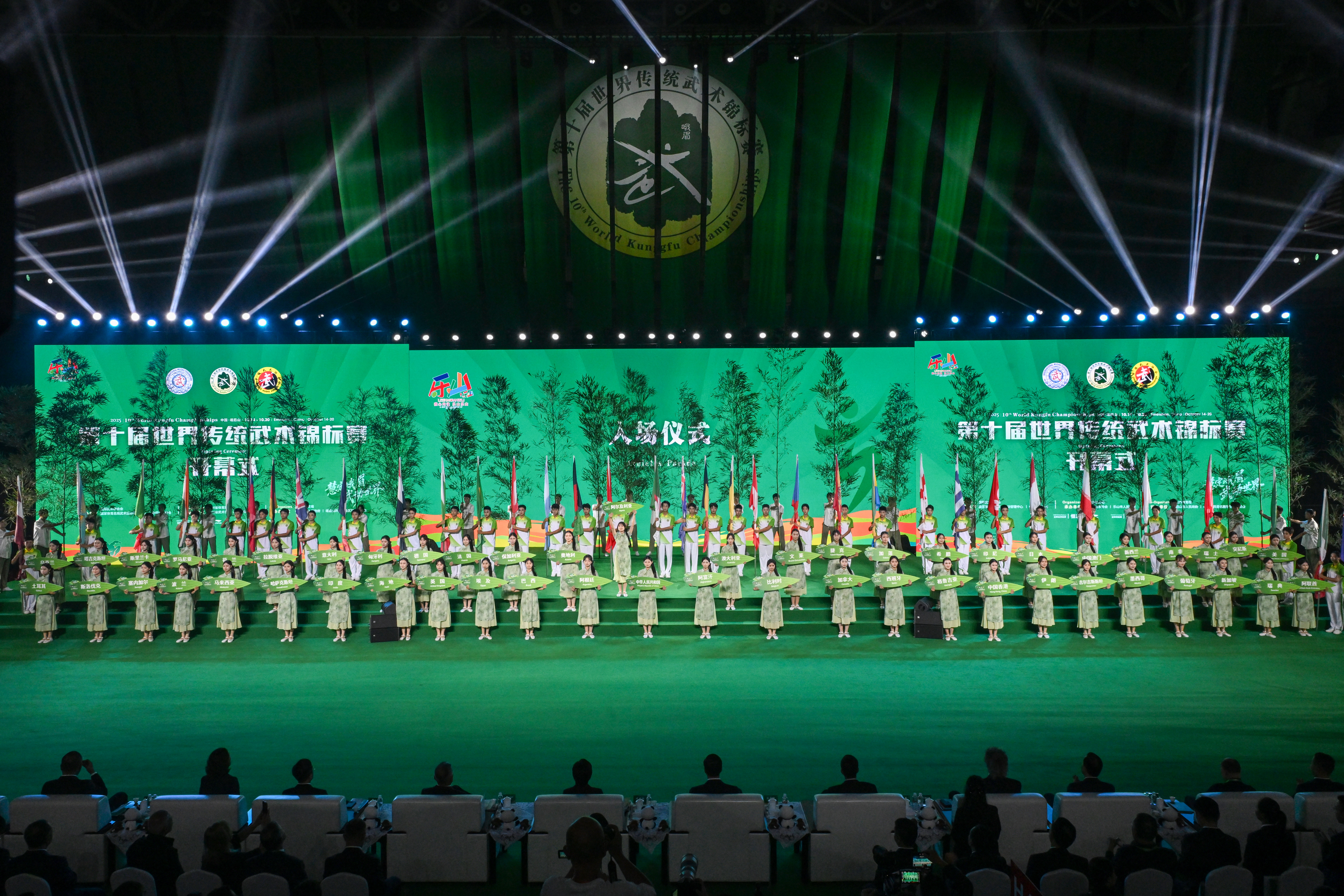 10月16日,第十届世界传统武术锦标赛开幕式在四川省乐山峨眉山市举行,来自50多个国家和地区的5000余名运动员将展开较量。图为开幕式上峨眉女子功夫团现场展示。中新社