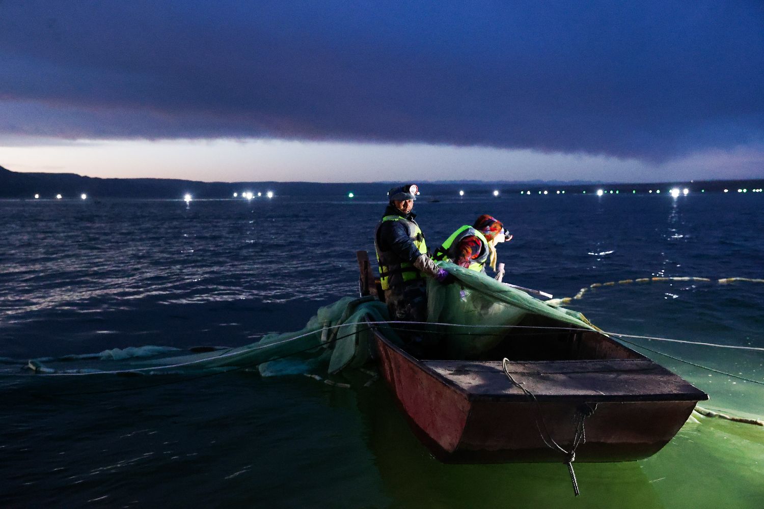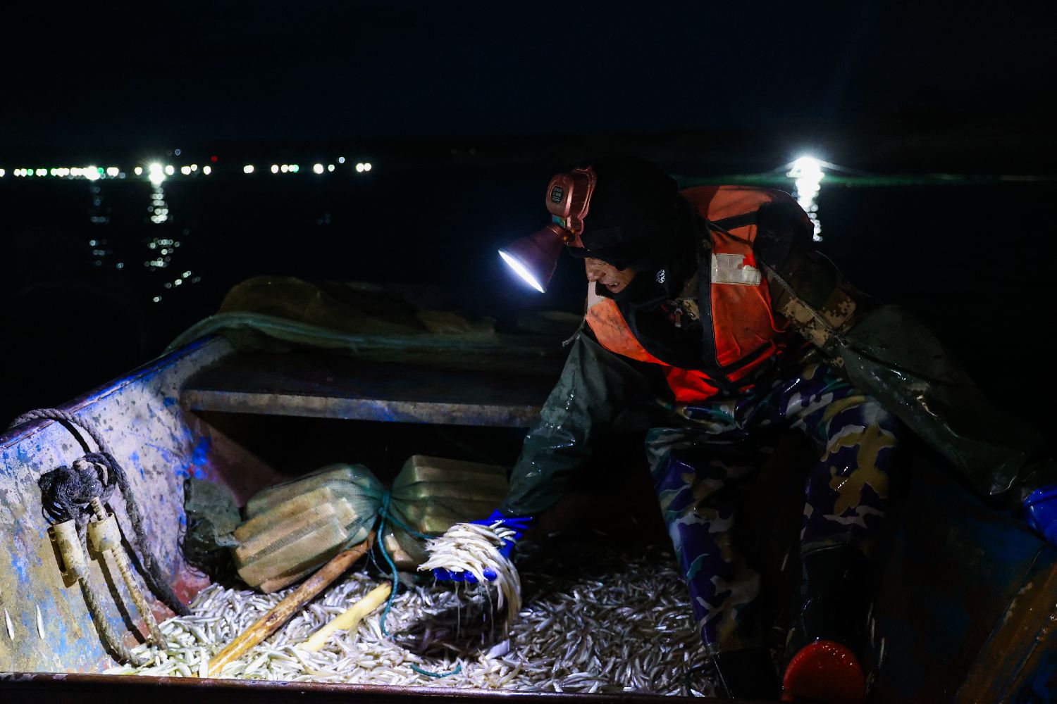 10月14日,渔民查看捕获的池沼公鱼。中新社