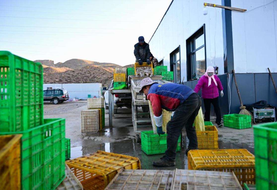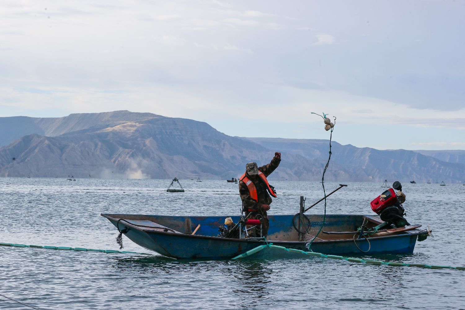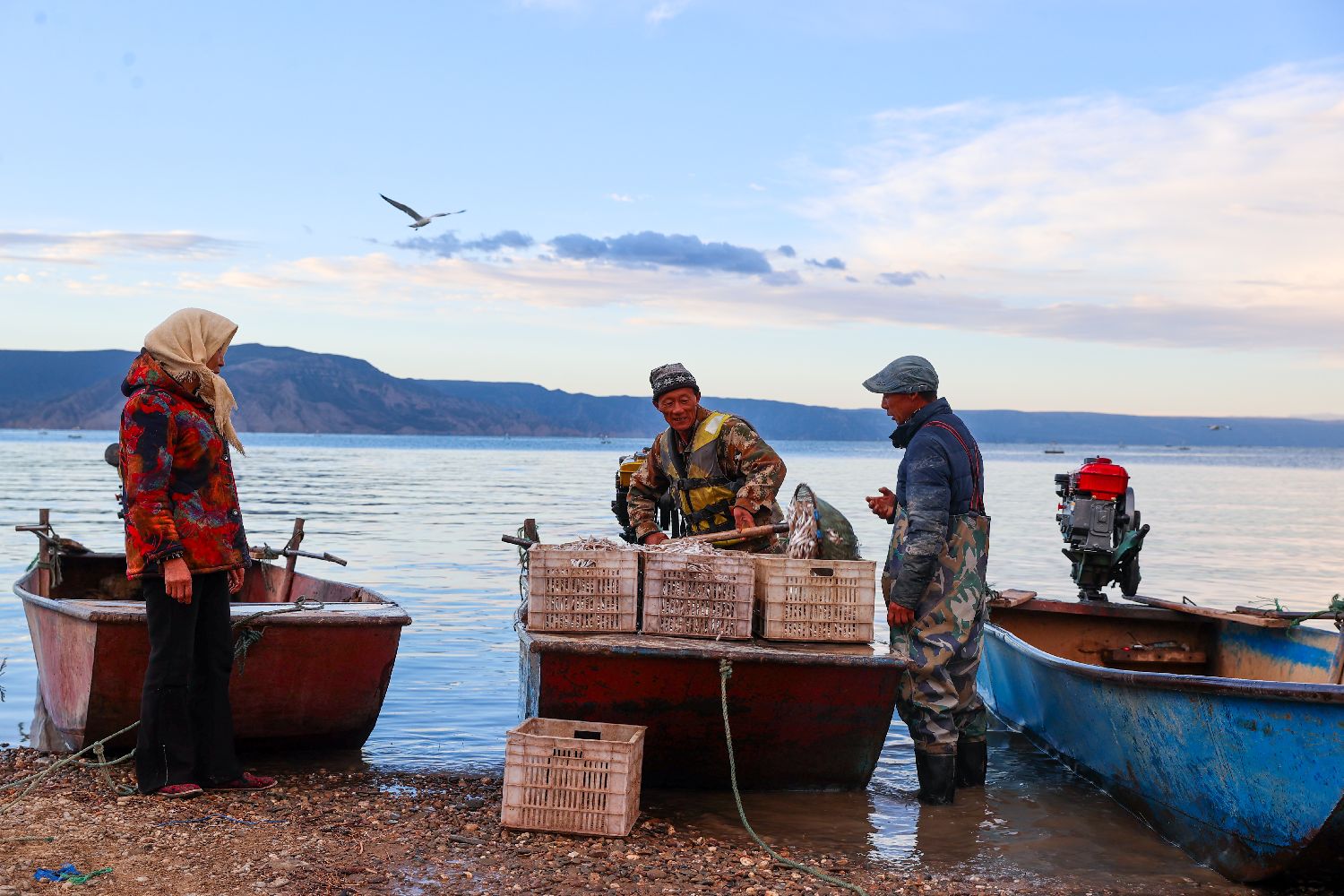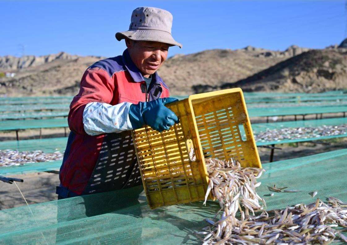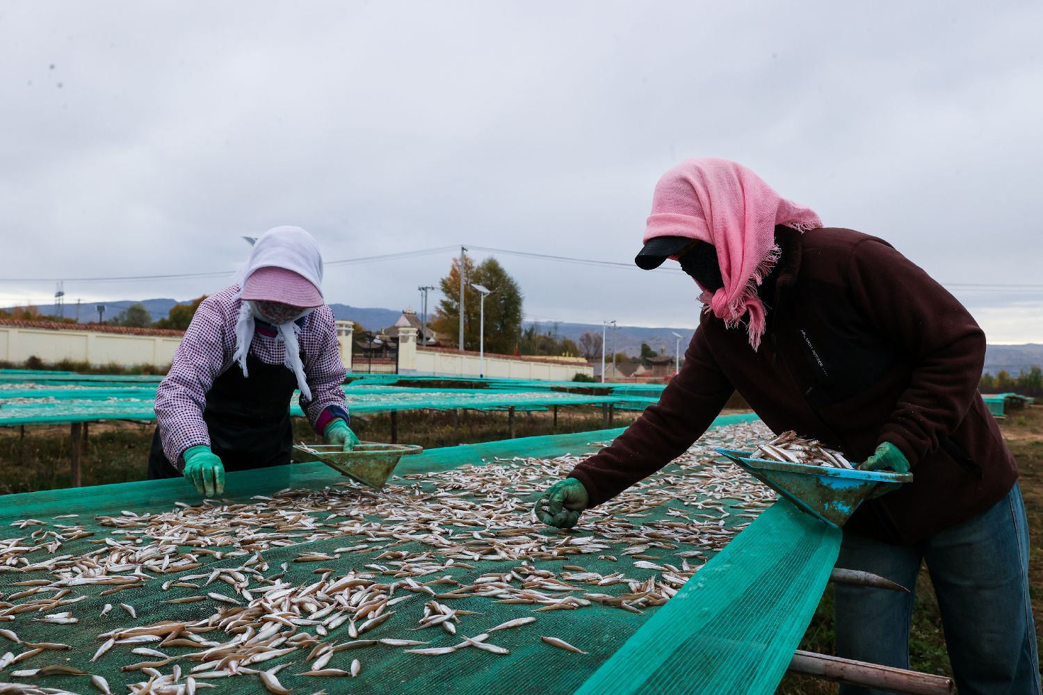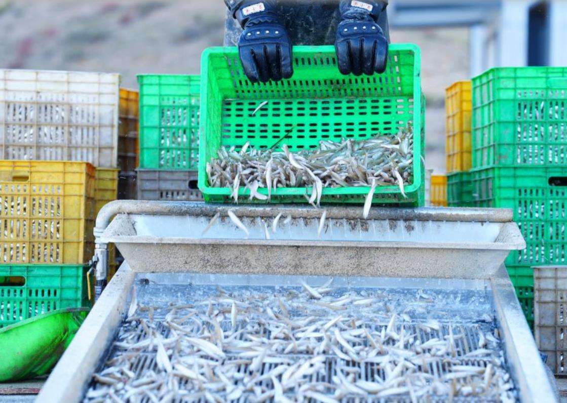 10月18日,在青海省海南藏族自治州共和县龙羊新村龙羊峡海湖渔业捕捞合作社,工人收拾新捕的小银鱼。新华社