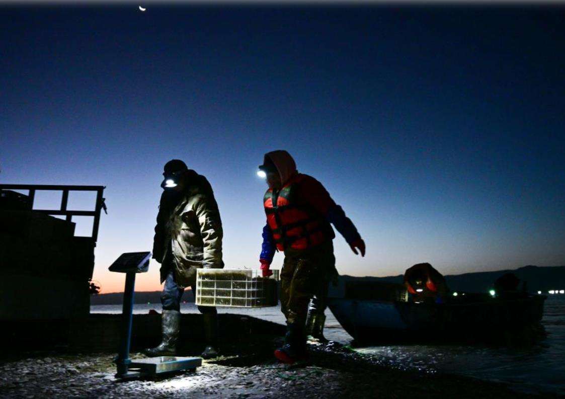 10月14日,渔民将捕捞的池沼公鱼装箱。中新社