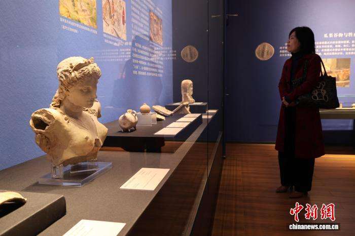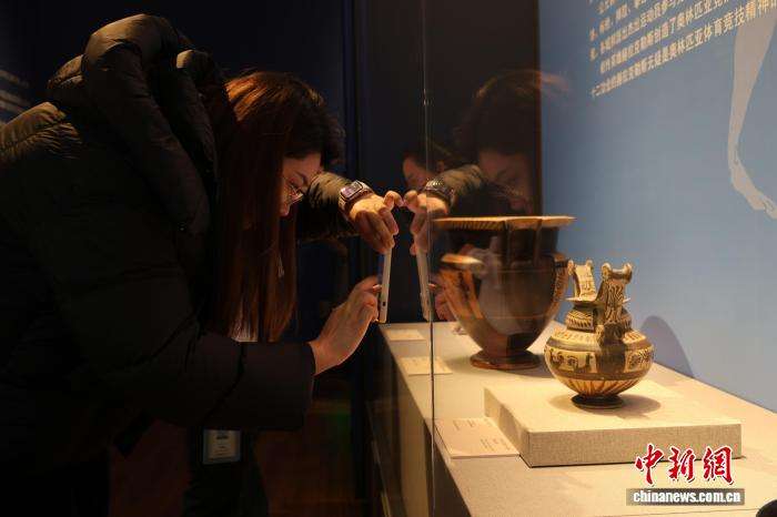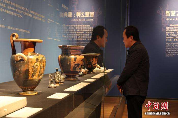 10月21日,“奥林匹斯神的史诗——意大利普利亚古希腊文化艺术珍藏”展览在山东潍坊青州市博物馆开幕,展出陶器、雕塑、钱币等文物115件(套)。图为观众在展厅欣赏普利亚彩陶。