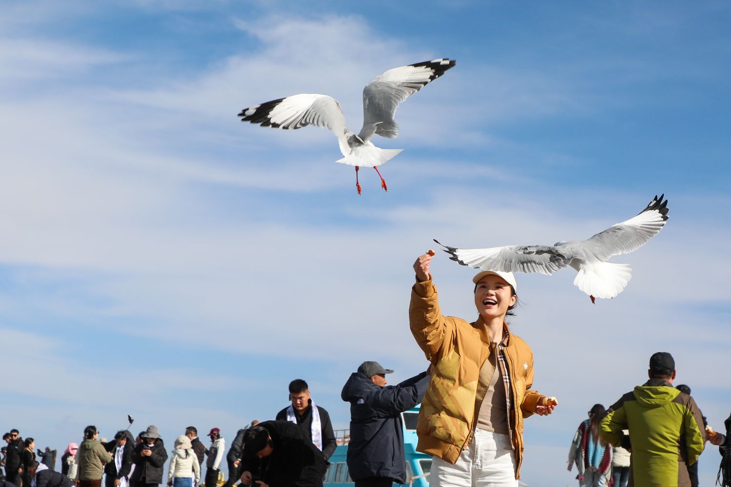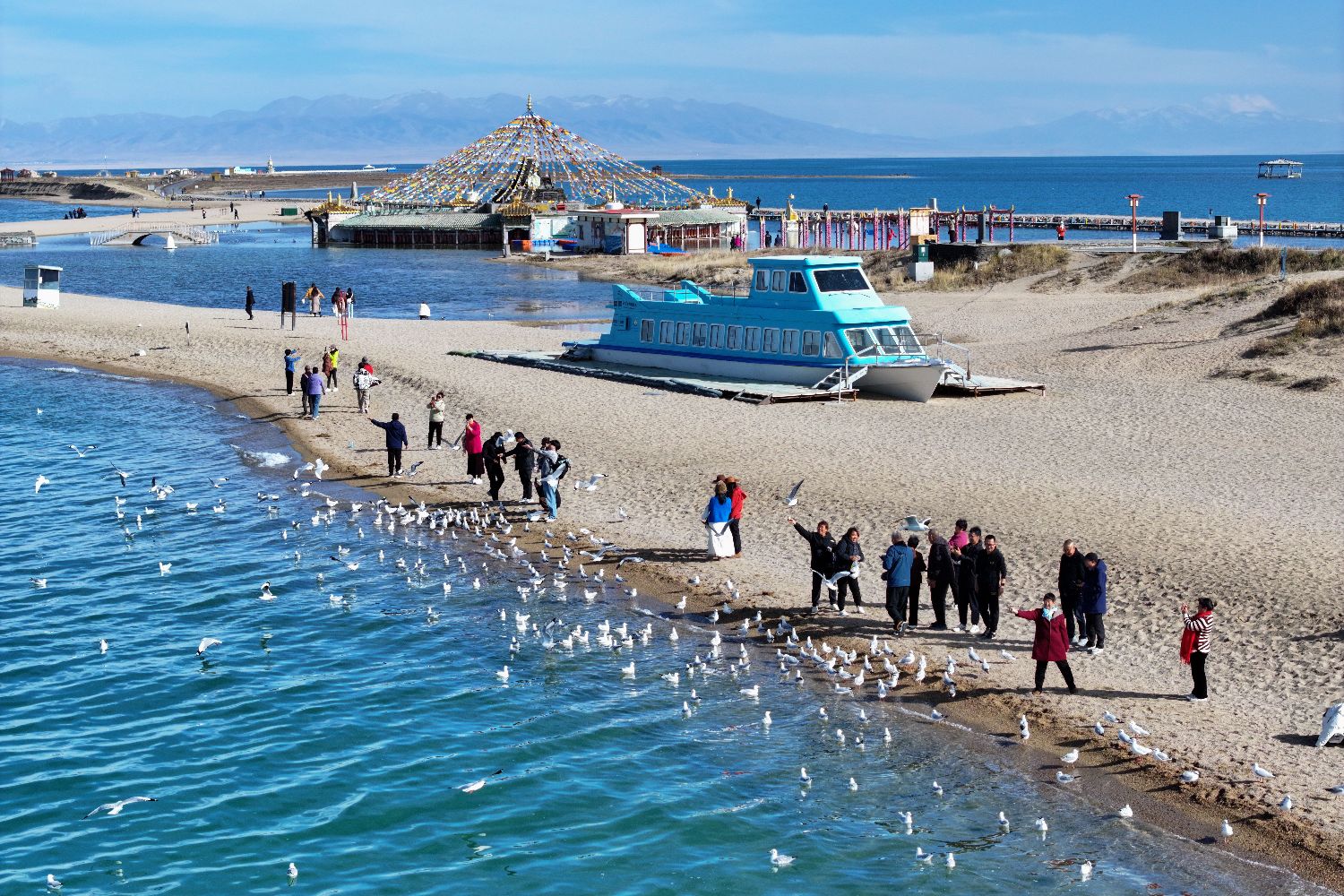 金秋十月,青海湖畔草地泛起金黄,羊群在草地上悠然自在,碧蓝的湖面上,水鸟翩跹,与游客亲密互动,构成一幅人与自然和谐共生的柔美画卷。图为10月22日,在青海省共和县青海湖畔,游客与水鸟互动。中新社