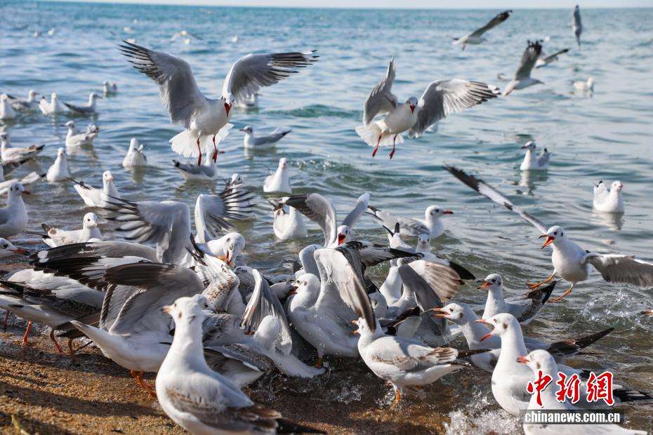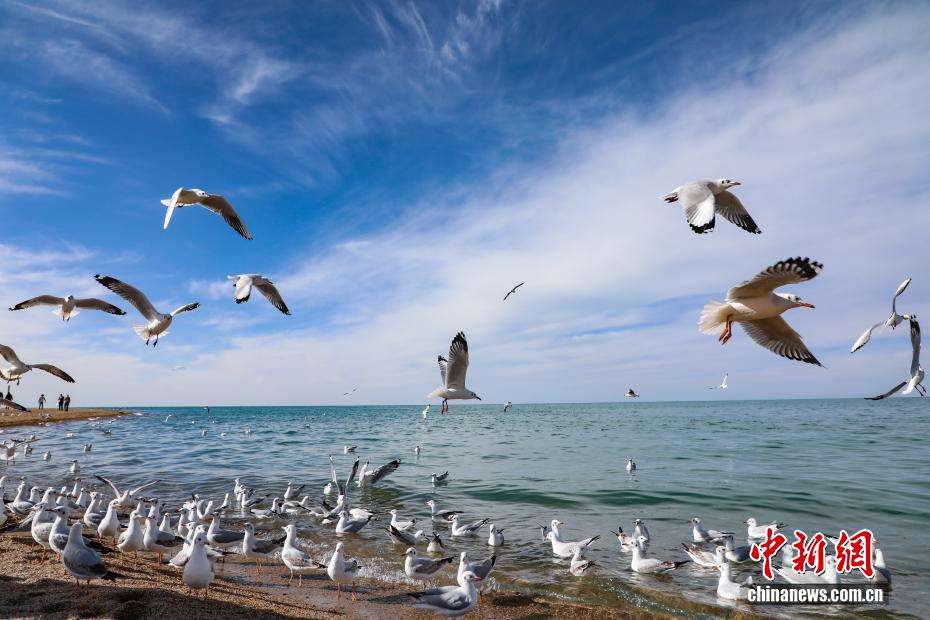 10月22日,在青海省海南藏族自治州共和县青海湖畔,水鸟振翅飞翔。中新网