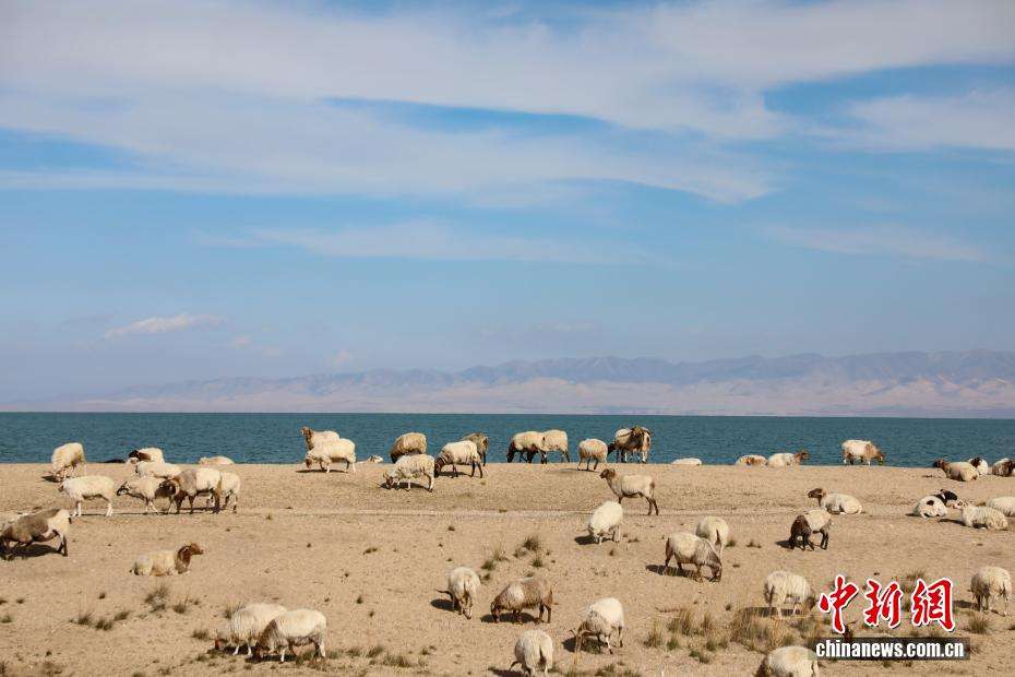 10月22日,在青海省海南藏族自治州共和县青海湖畔,羊群悠闲觅食。中新网