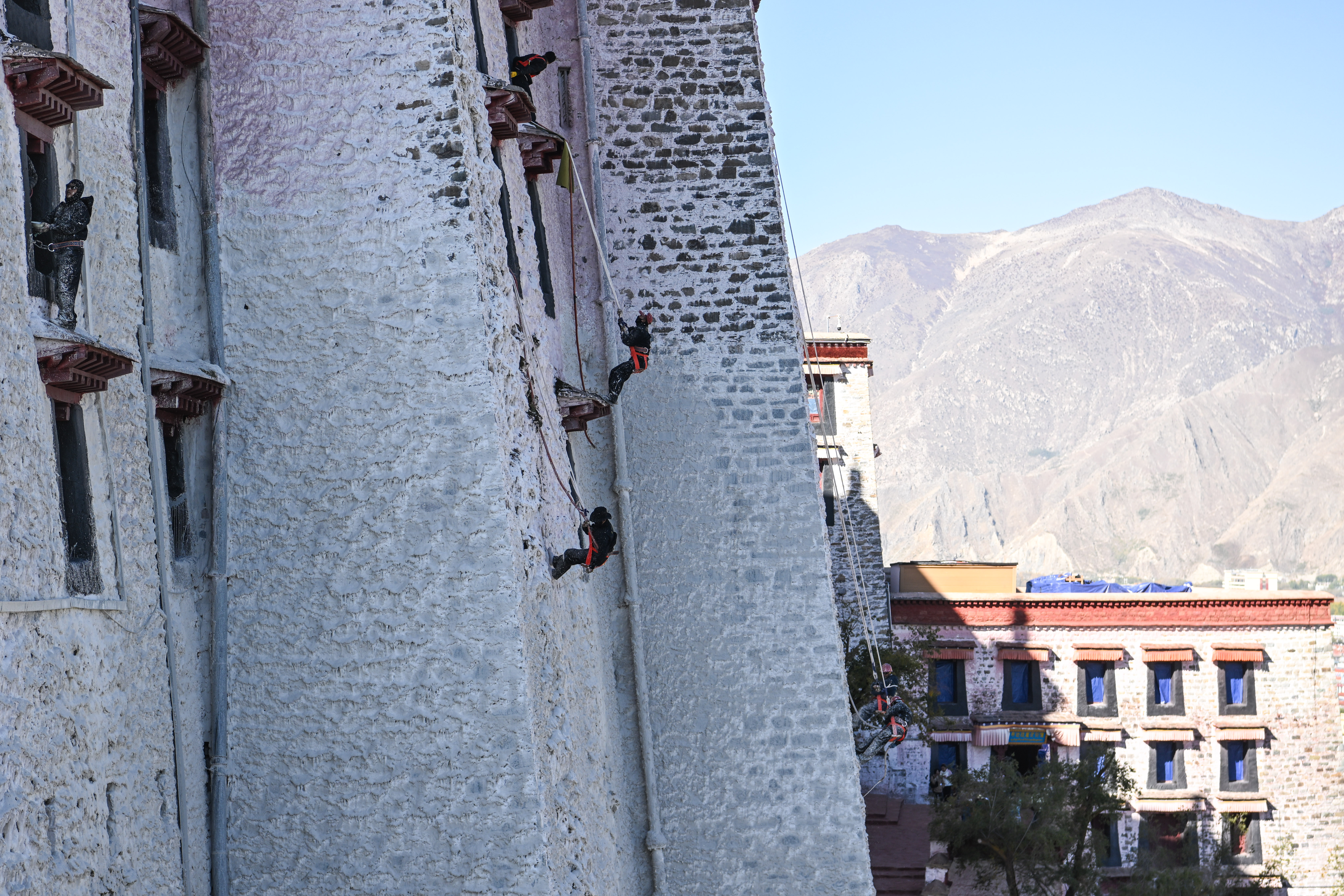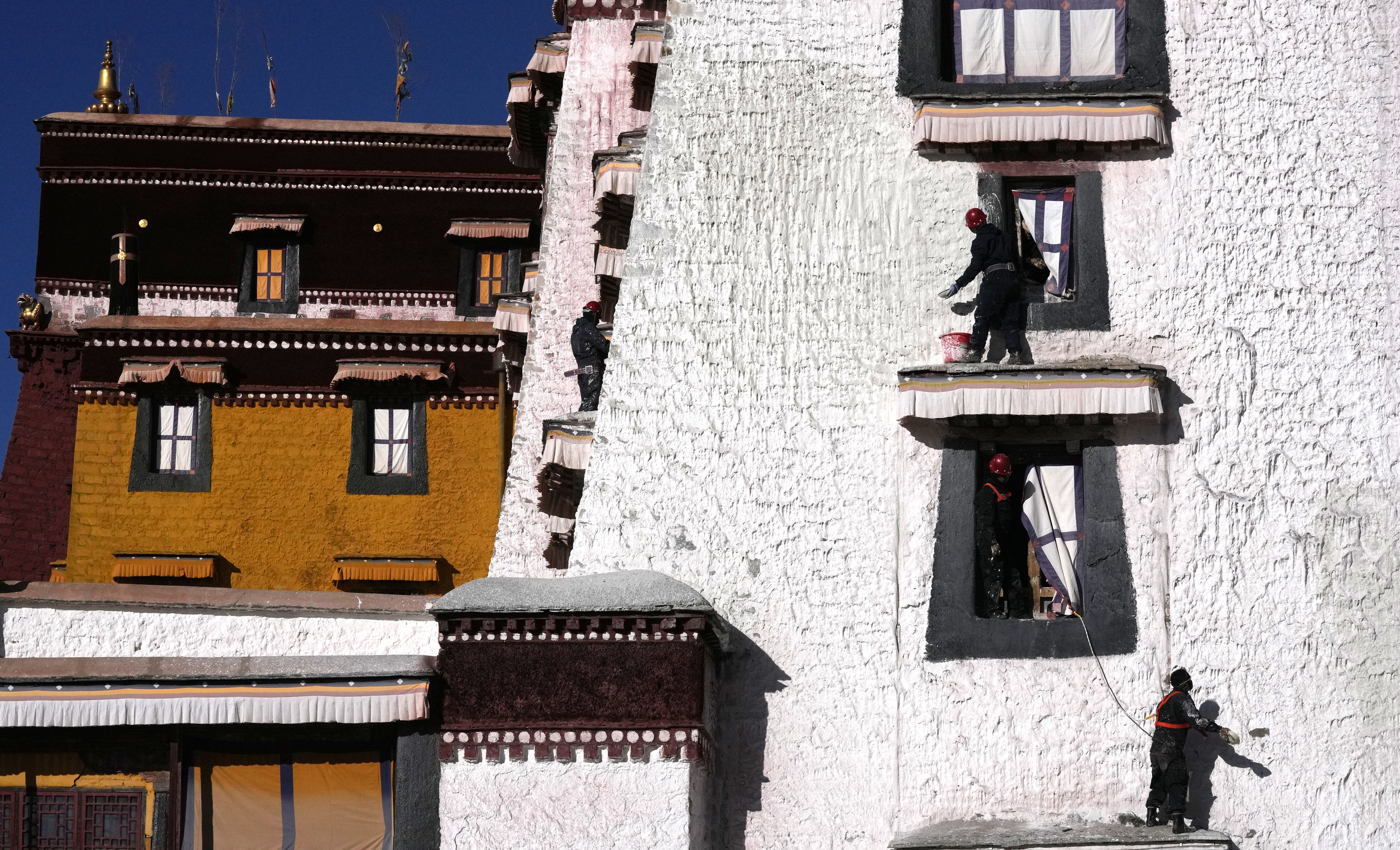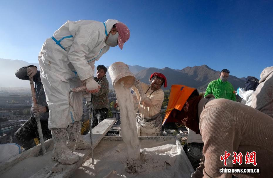 工作人员对布达拉宫外墙喷洒涂料。中新社