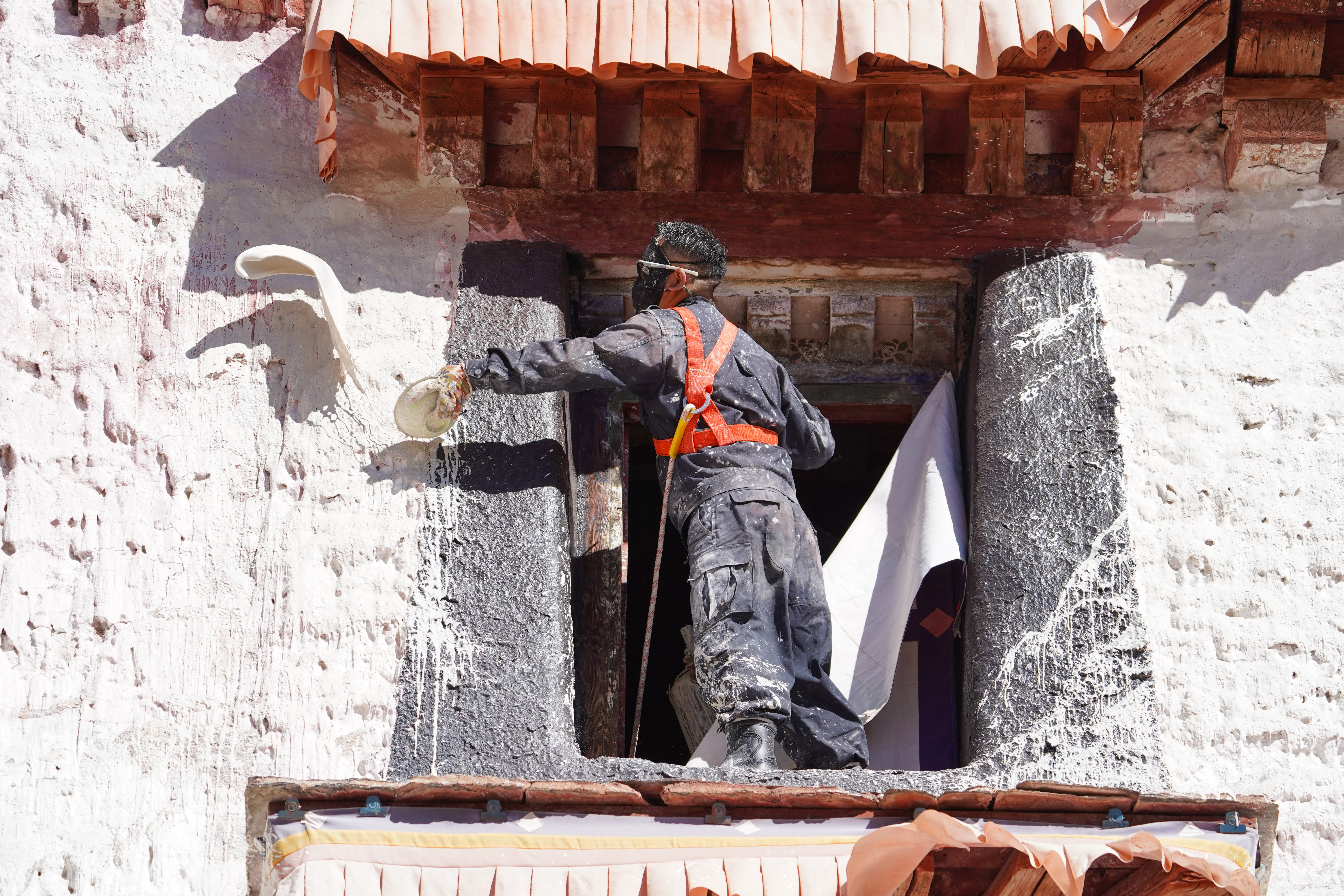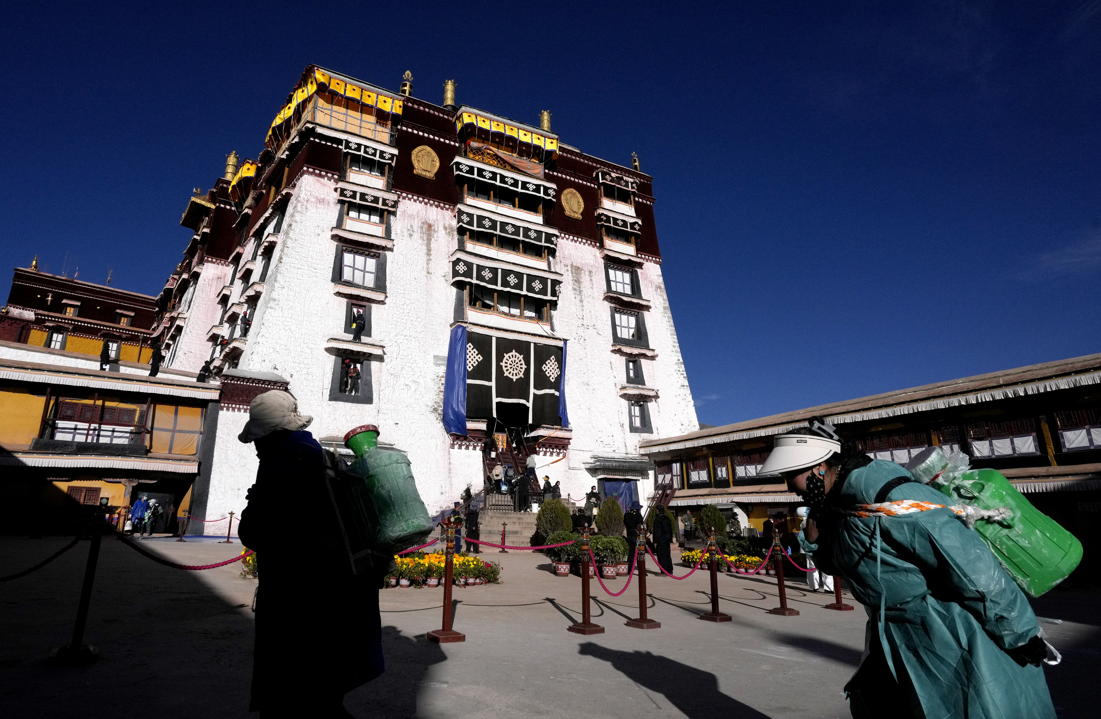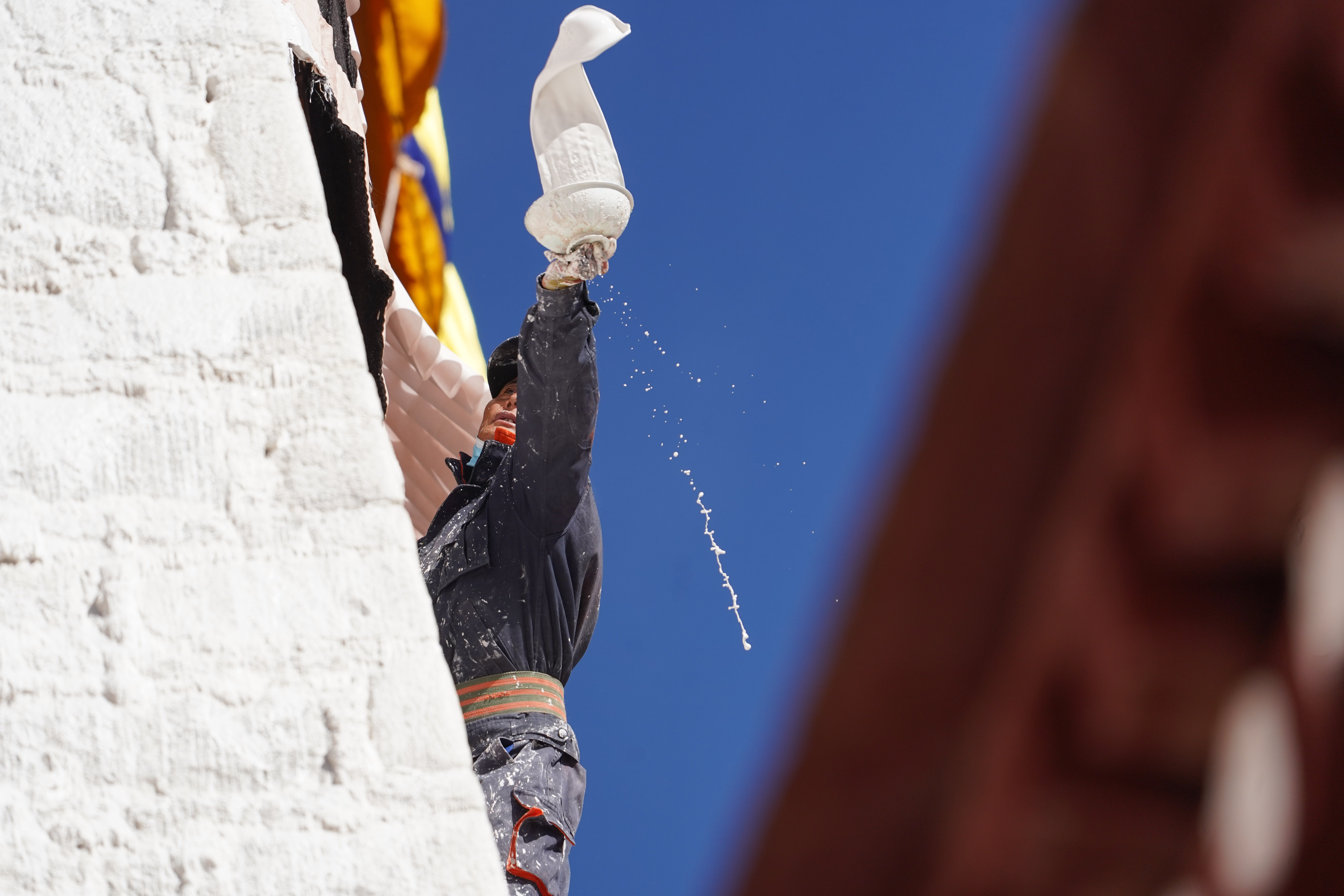 工作人员对布达拉宫外墙喷洒涂料。中新社