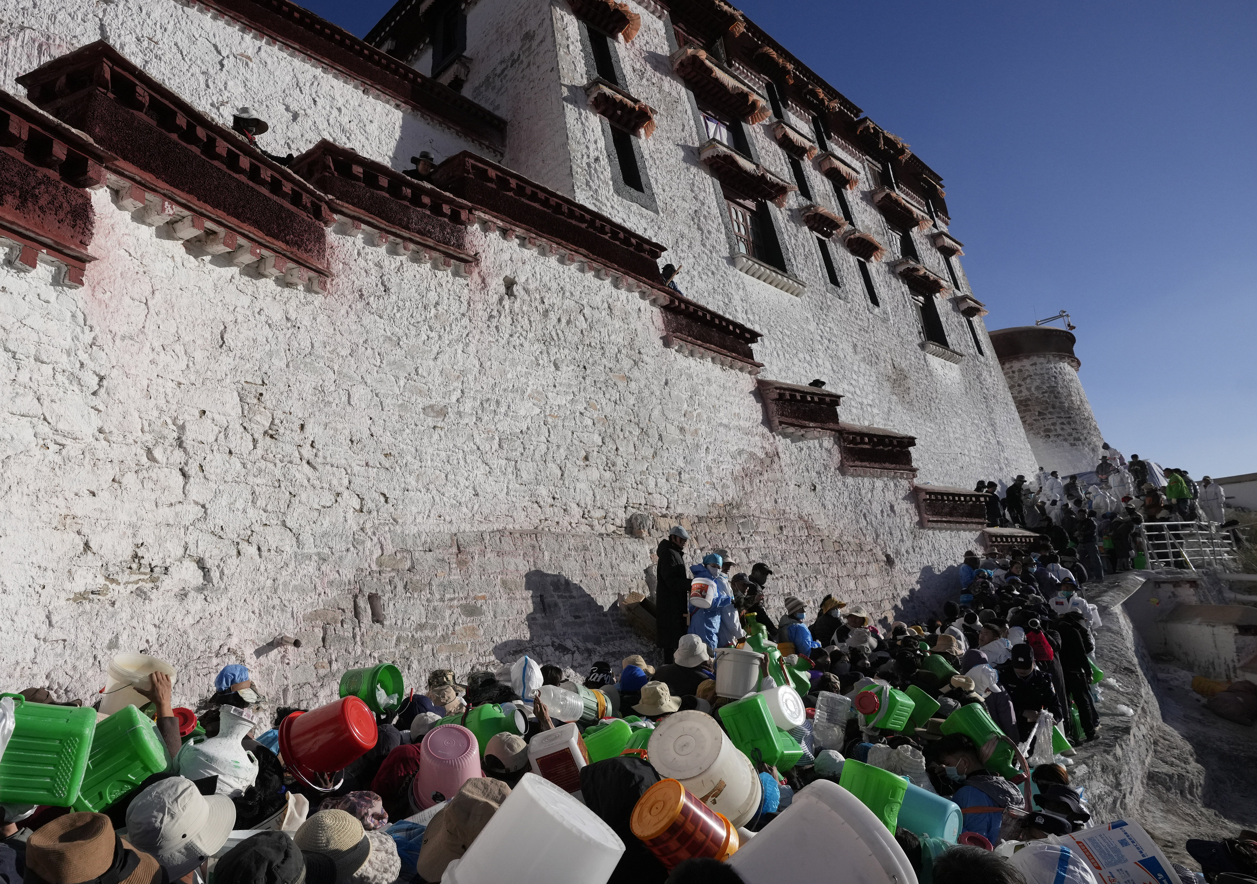 10月22日,西藏拉萨,世界文化遗产布达拉宫开始整体粉刷。当日,布达拉宫管理处工作人员和民众参与宫墙的粉刷工作,为布达拉宫年度“美颜”。图为民众排队搬运布达拉宫粉刷使用的涂料。 中新社